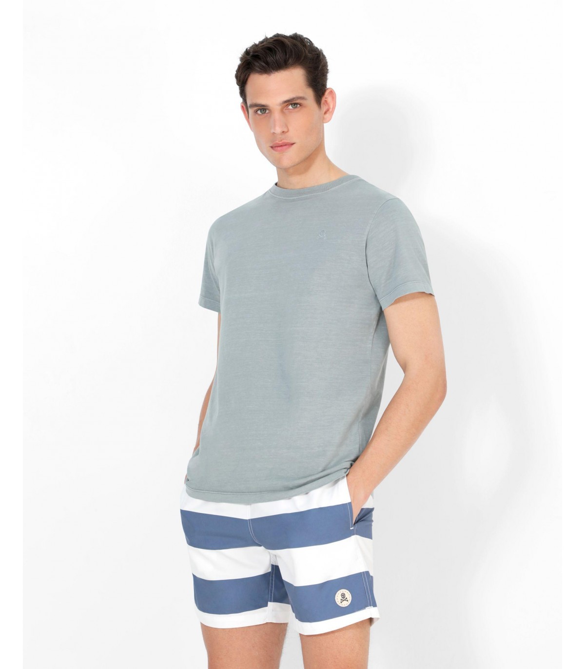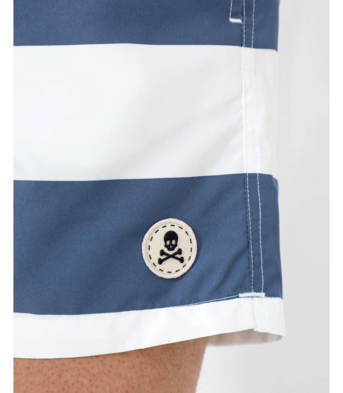 - Bañador con estampado de rayas. Corte Regular Fit, cierre con cordón y cintura elástica. Bolsillos laterales y trasero y detalle de parche de calavera.