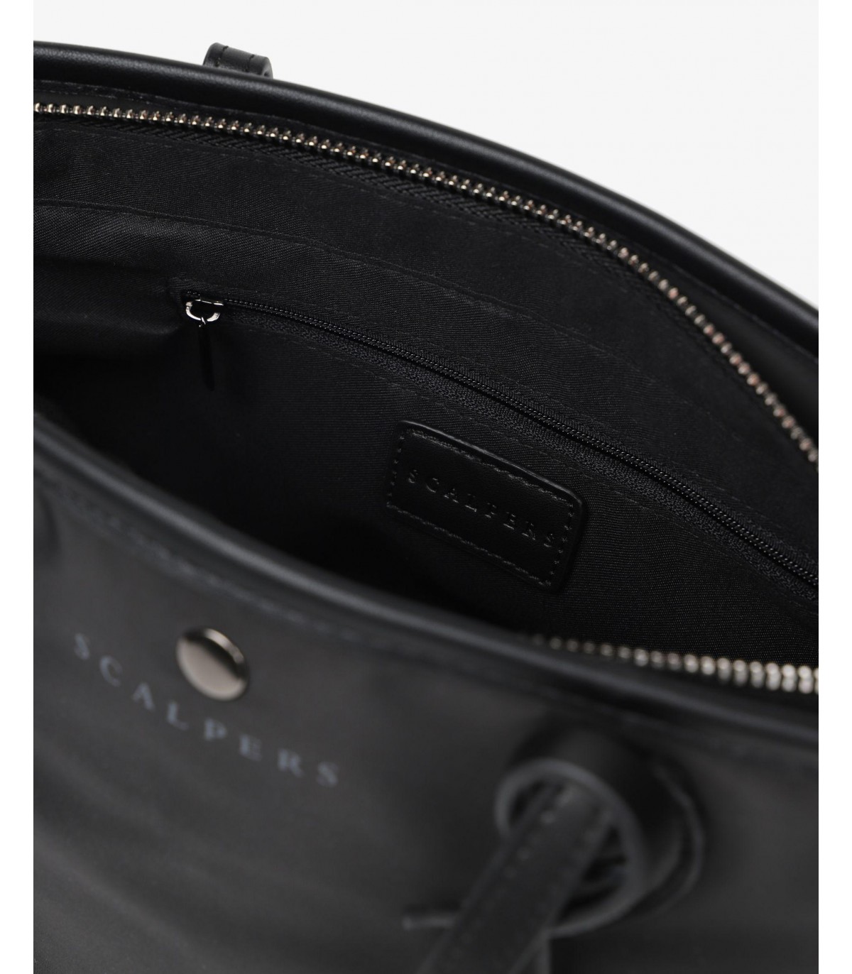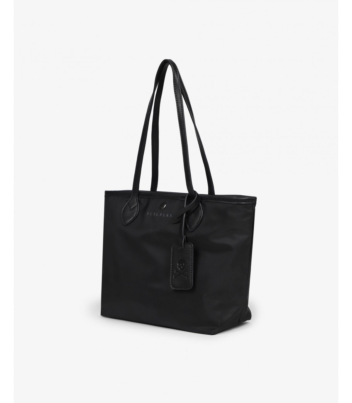 - Bolso shopper mini confeccionado en tejido técnico. Doble asa de piel, cierre con cremallera y bolsillos interiores. Detalle de calavera en piel.