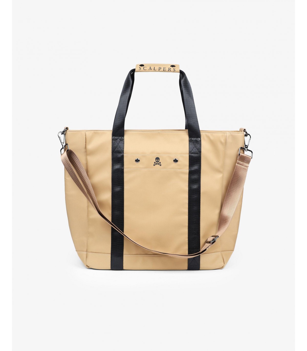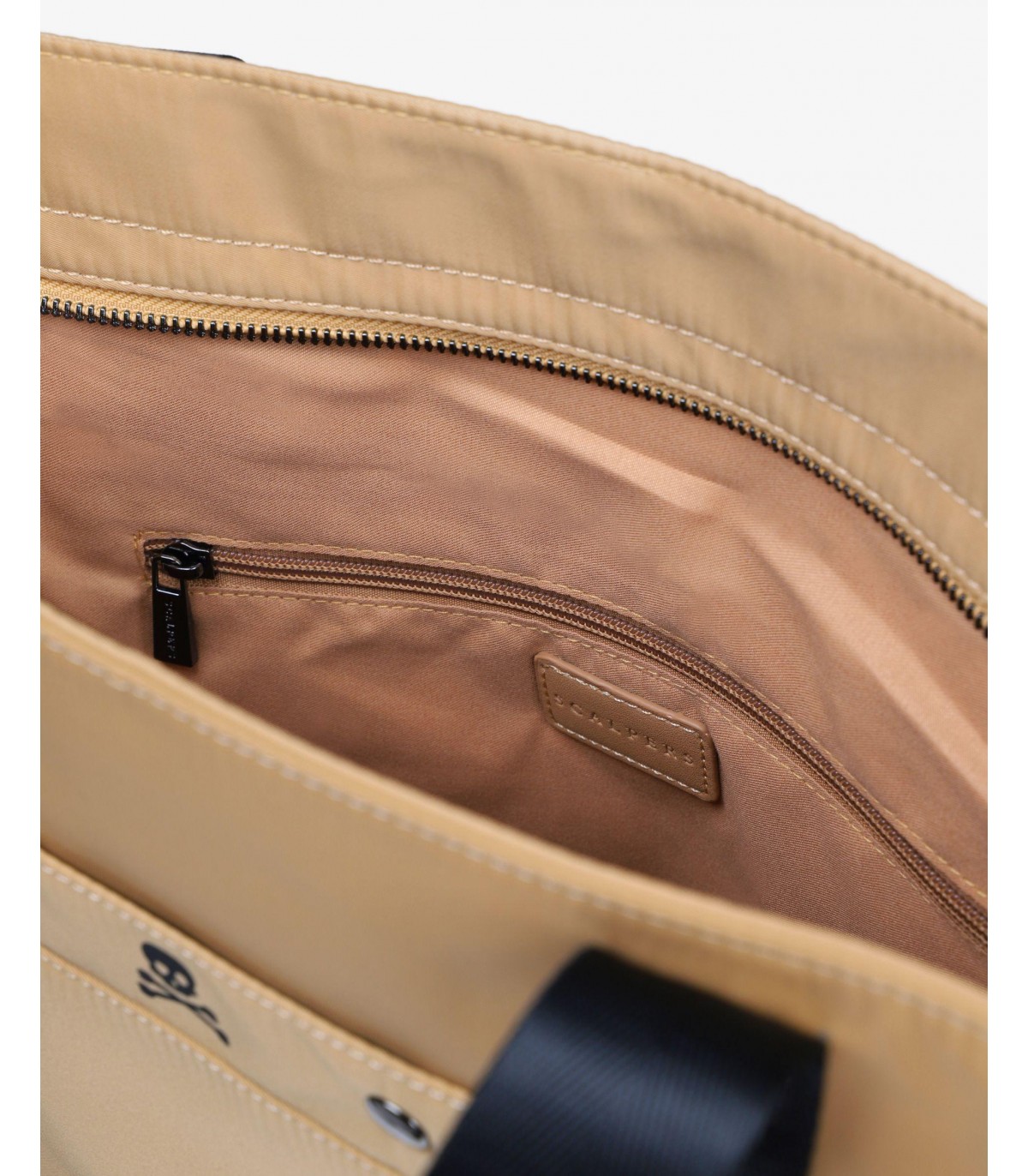Bolso maxi shopper confeccionada en tejido técnico. Doble asas cortas y larga y cierre con cremallera. Bolsillo interior con cremallera y detalle de calavera.