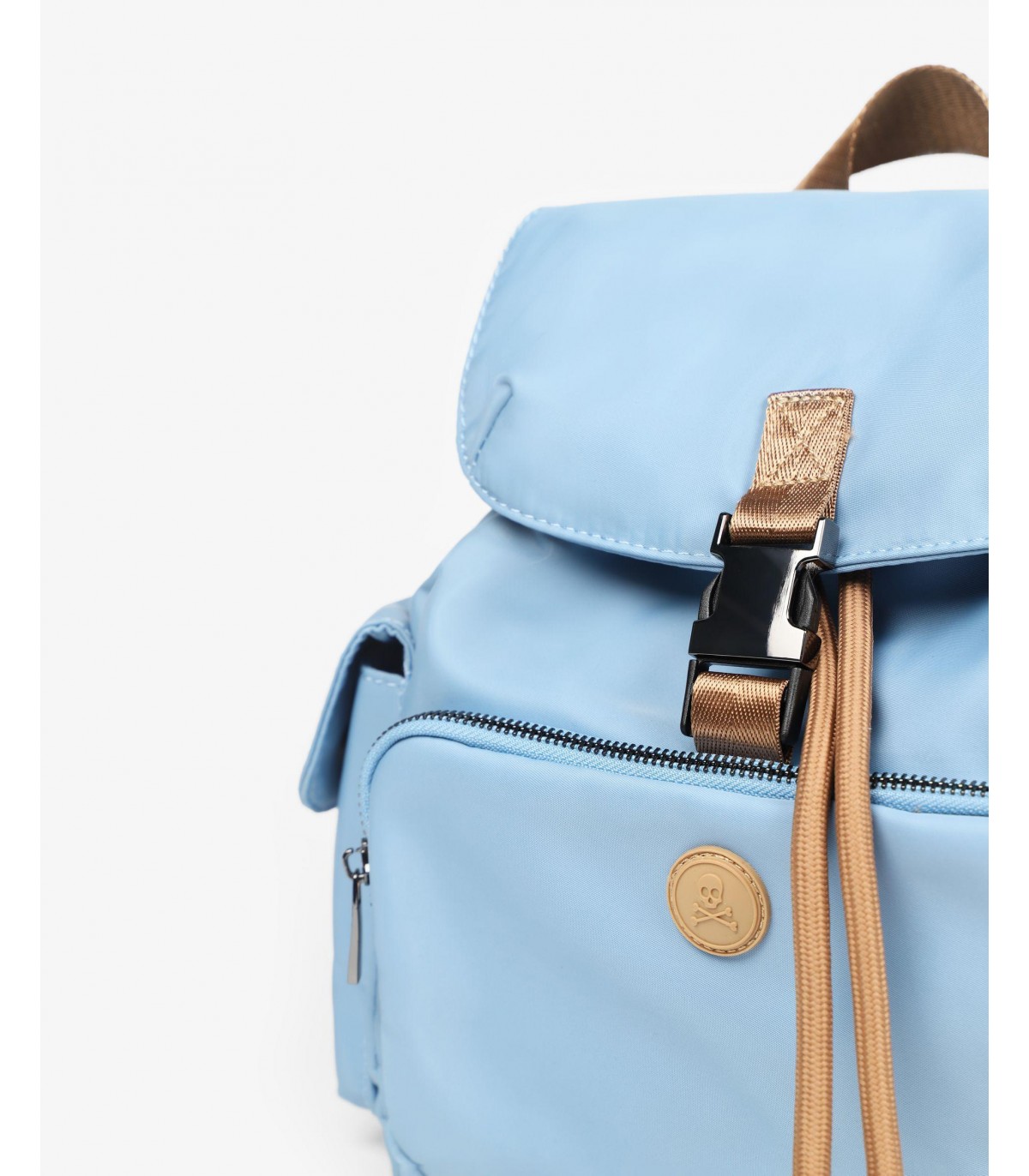 - Mochila confeccionada en tejido técnico. Cierre tipo mochila con cordón ajustable. Bolsillos laterales y frontal con cremallera. Detalle de calavera engomada.