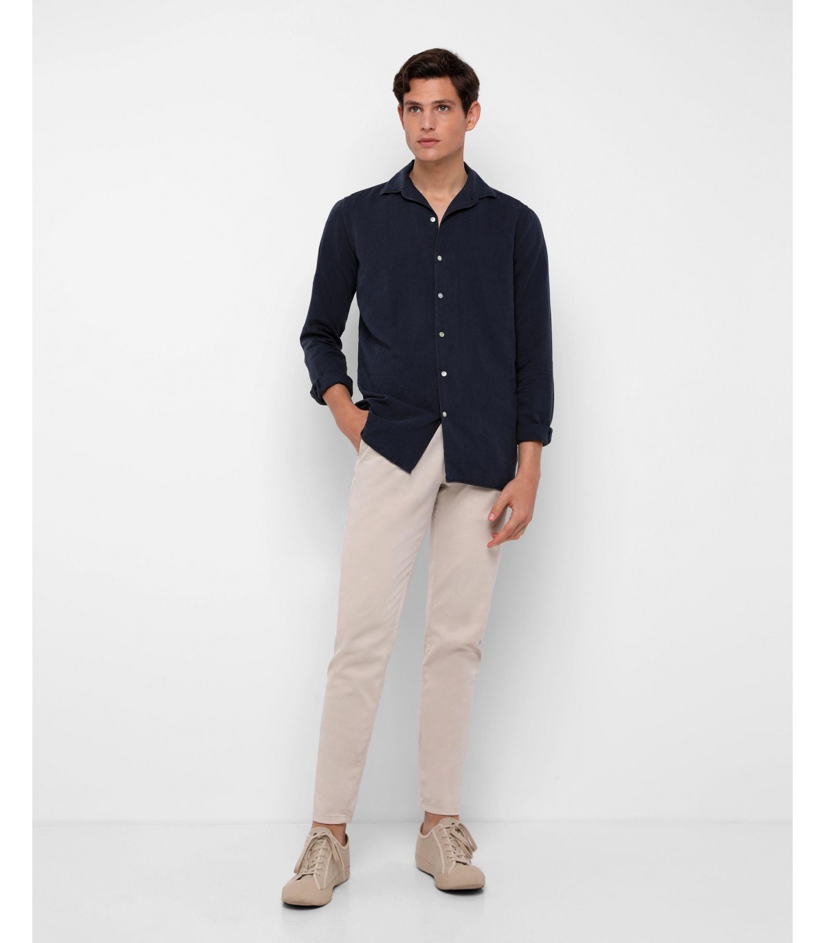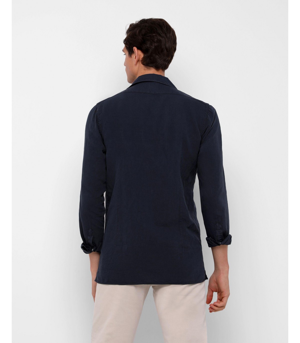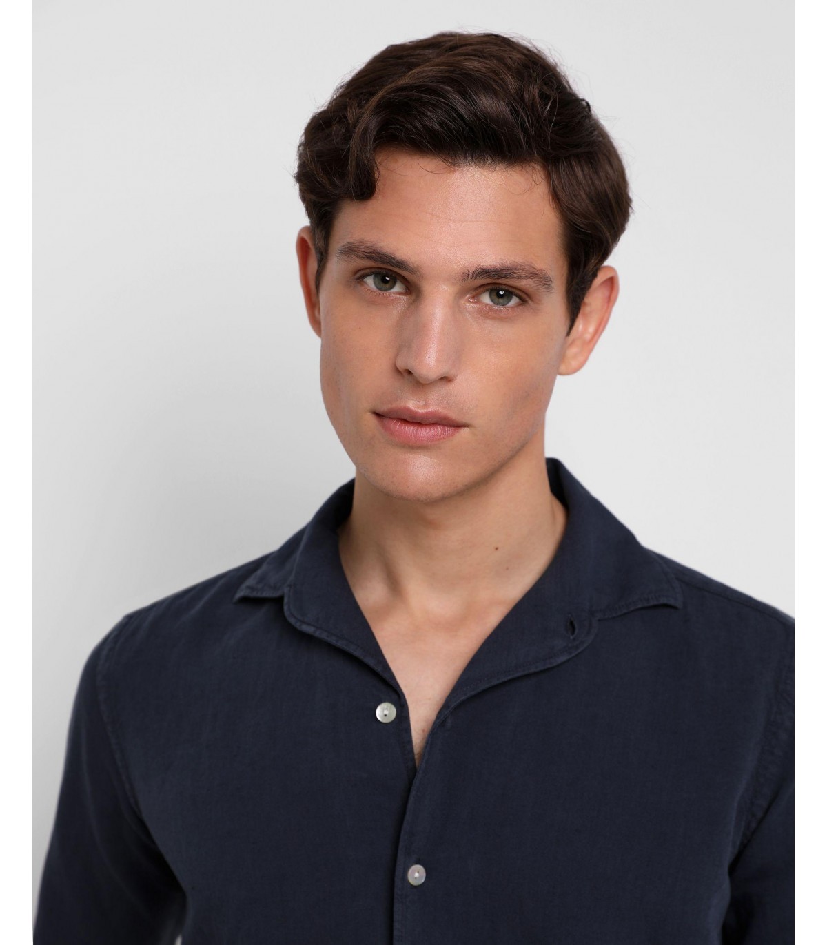 - Camisa confeccionada en tejido 100% lino. Corte Regular Fit, cuello pijamero y cierre con botones. Manga larga terminada en puño con botones.