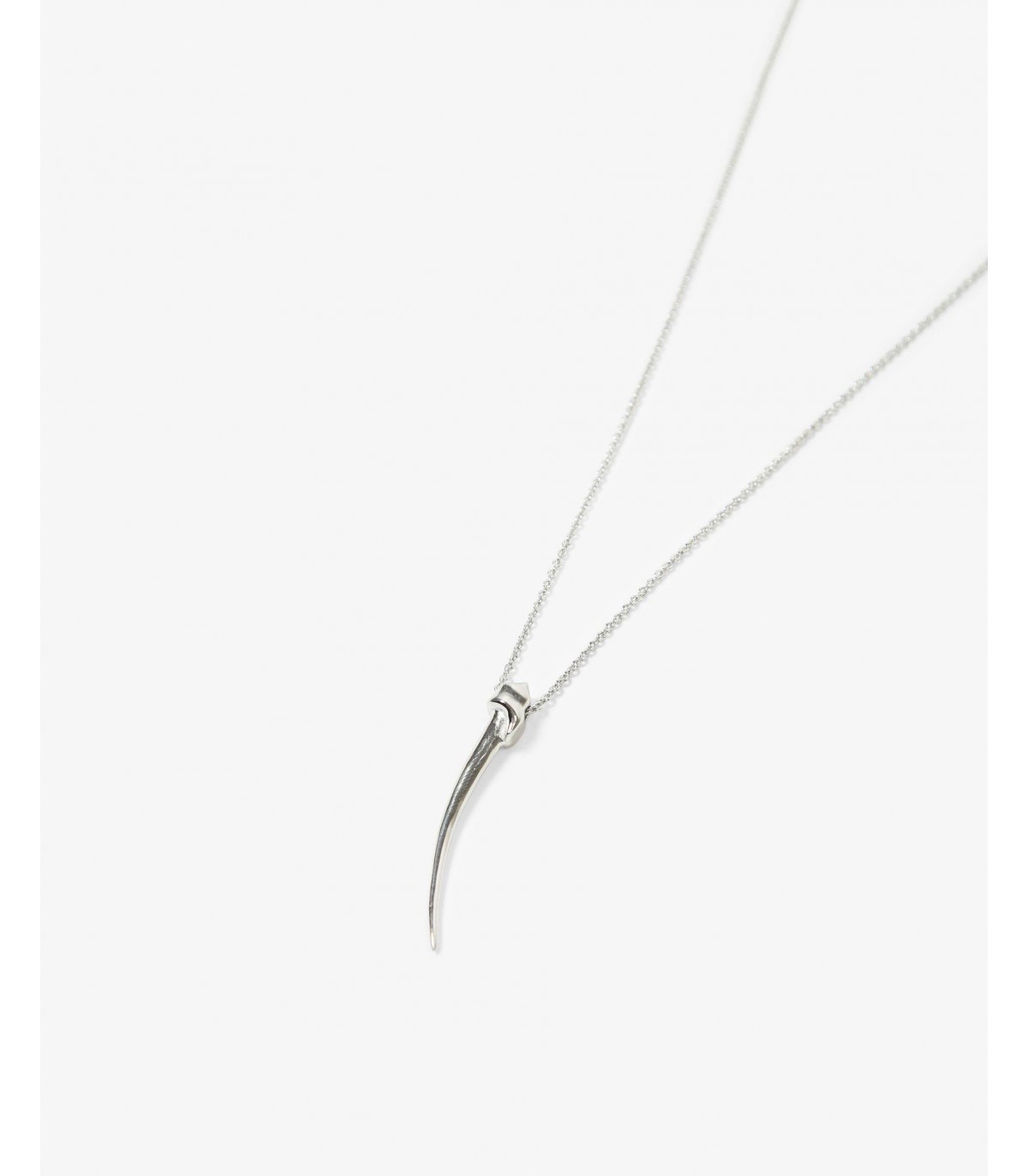 - Collar largo con colgante con forma de cuerno de bronce bañado en plata de ley. Colgante y cadena con cierre de mosquetón. La cadena mide 60cm + 5cm ajustables.