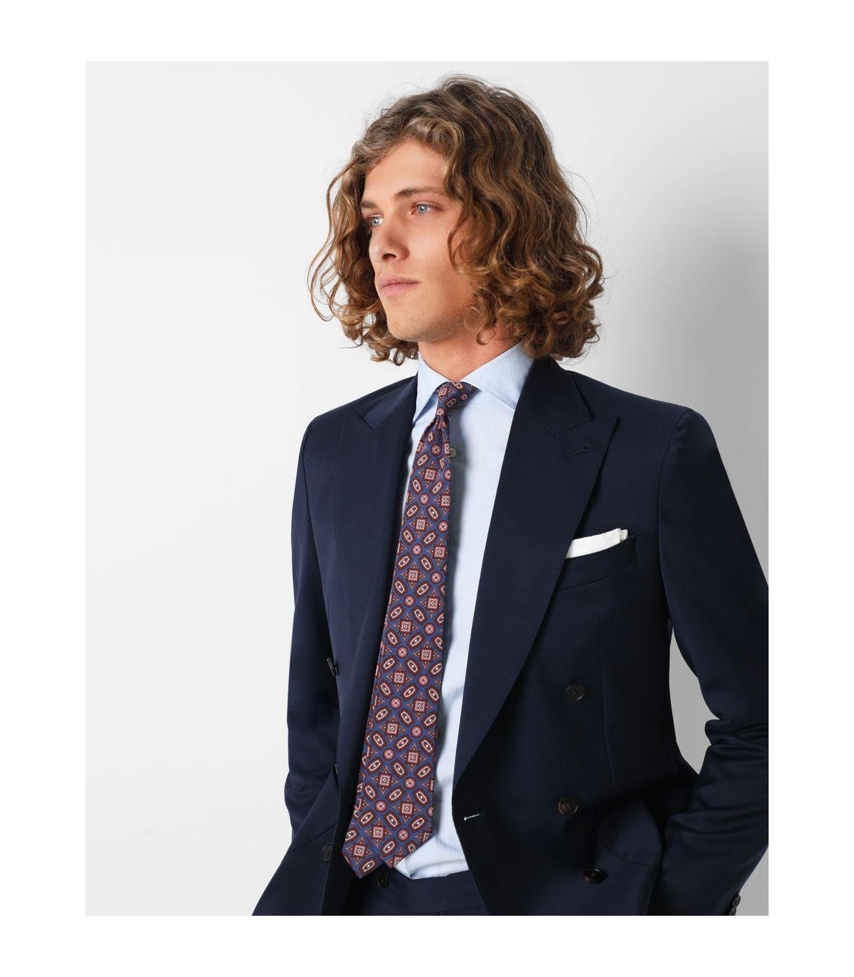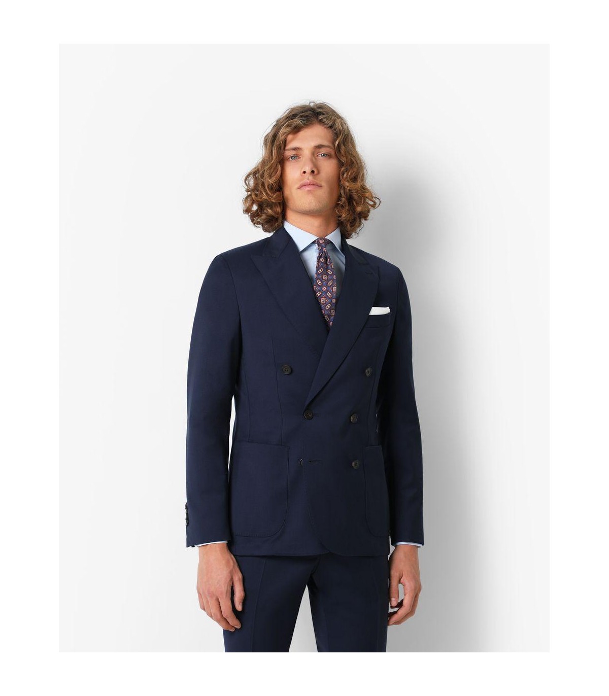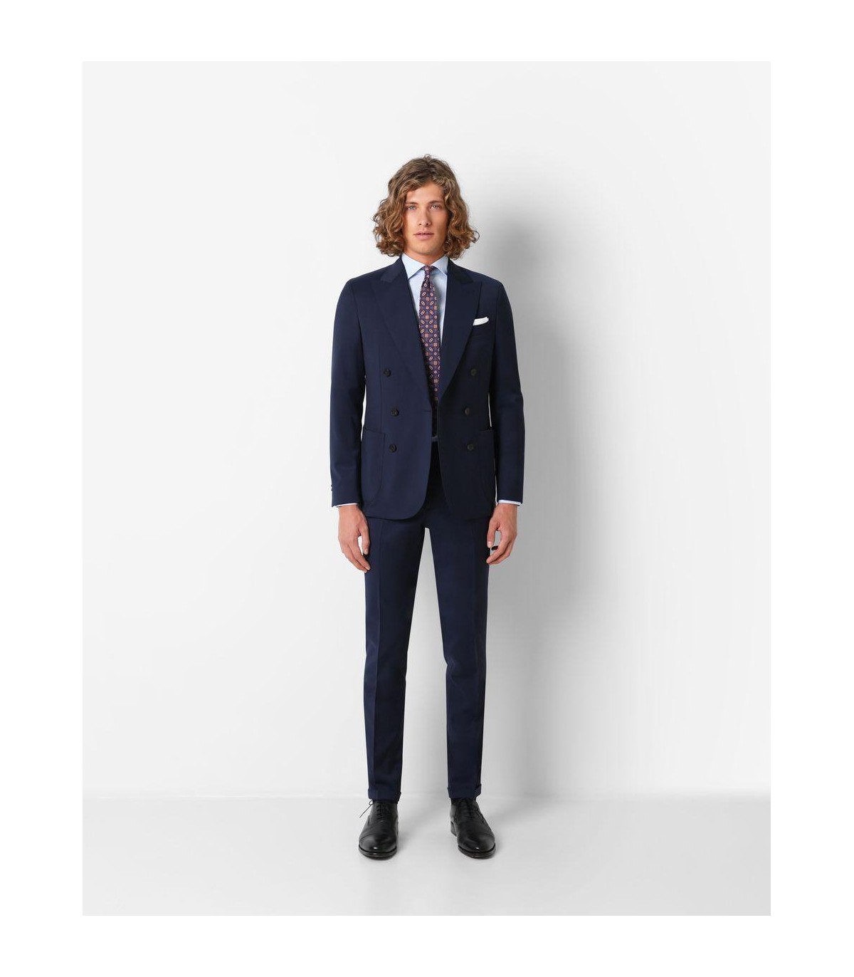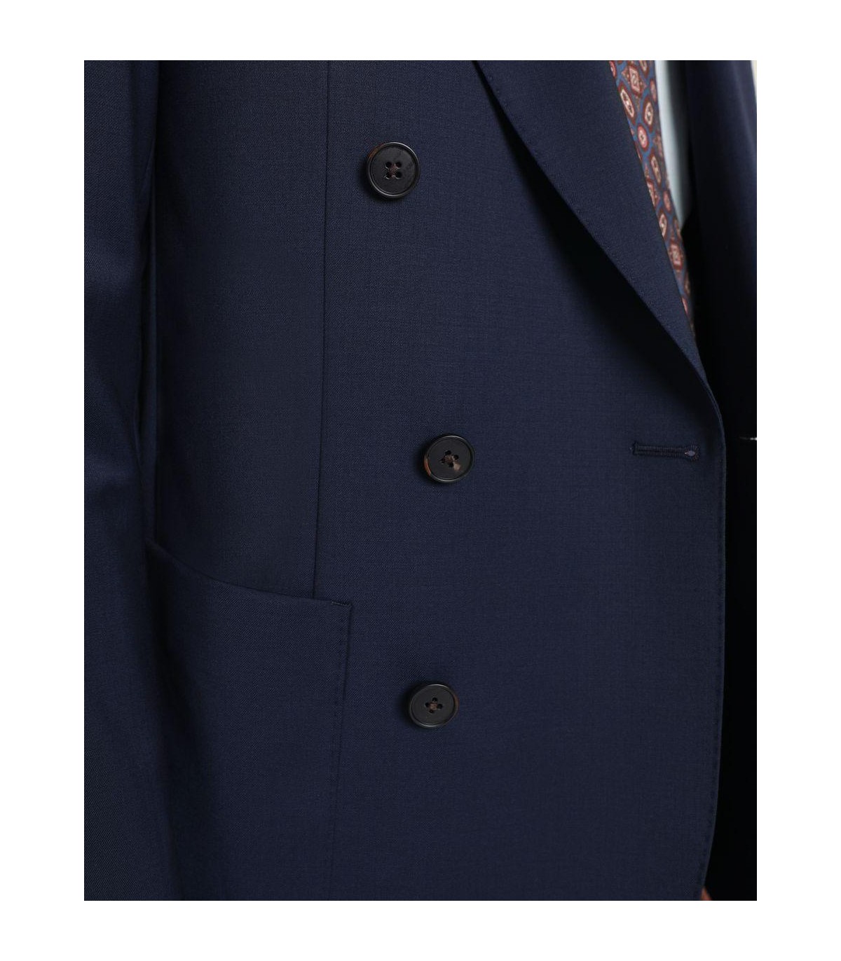 - Traje confeccionado en tejido de lana. Corte Regular Fit, americana de corte clásico, solapa punta de lanza y cierre cruzado con seis botones. Manga larga terminada en cuatro botones y dos bolsillos laterales y uno a la altura del pecho.