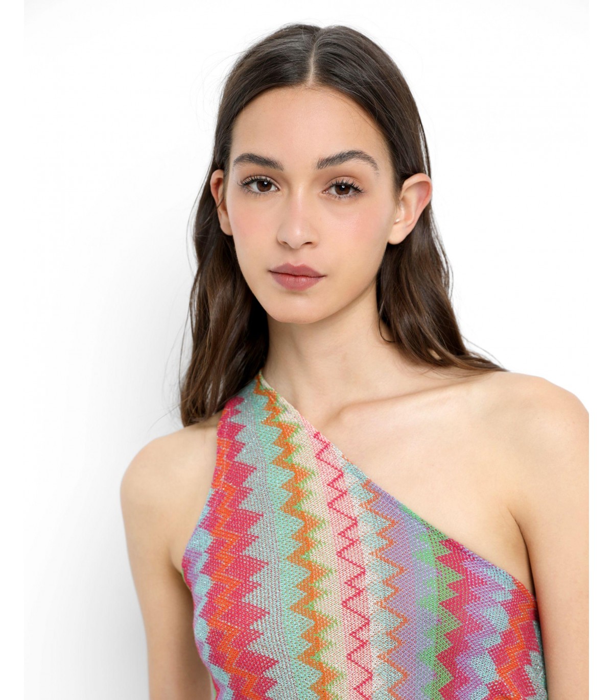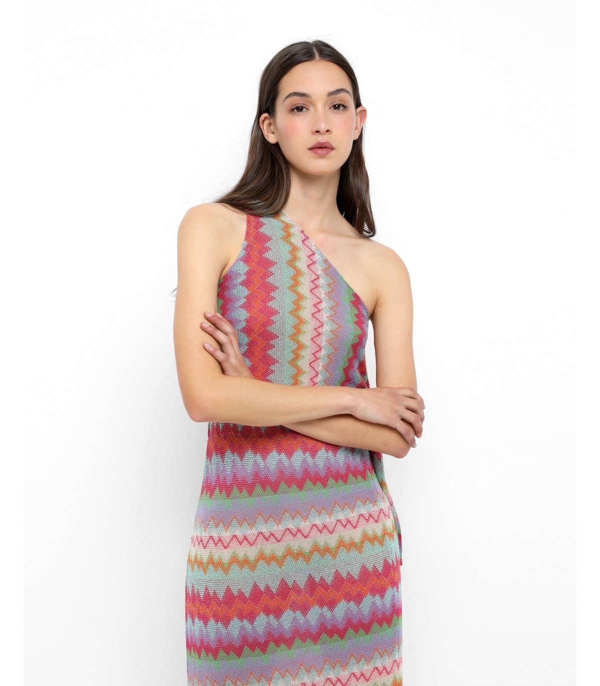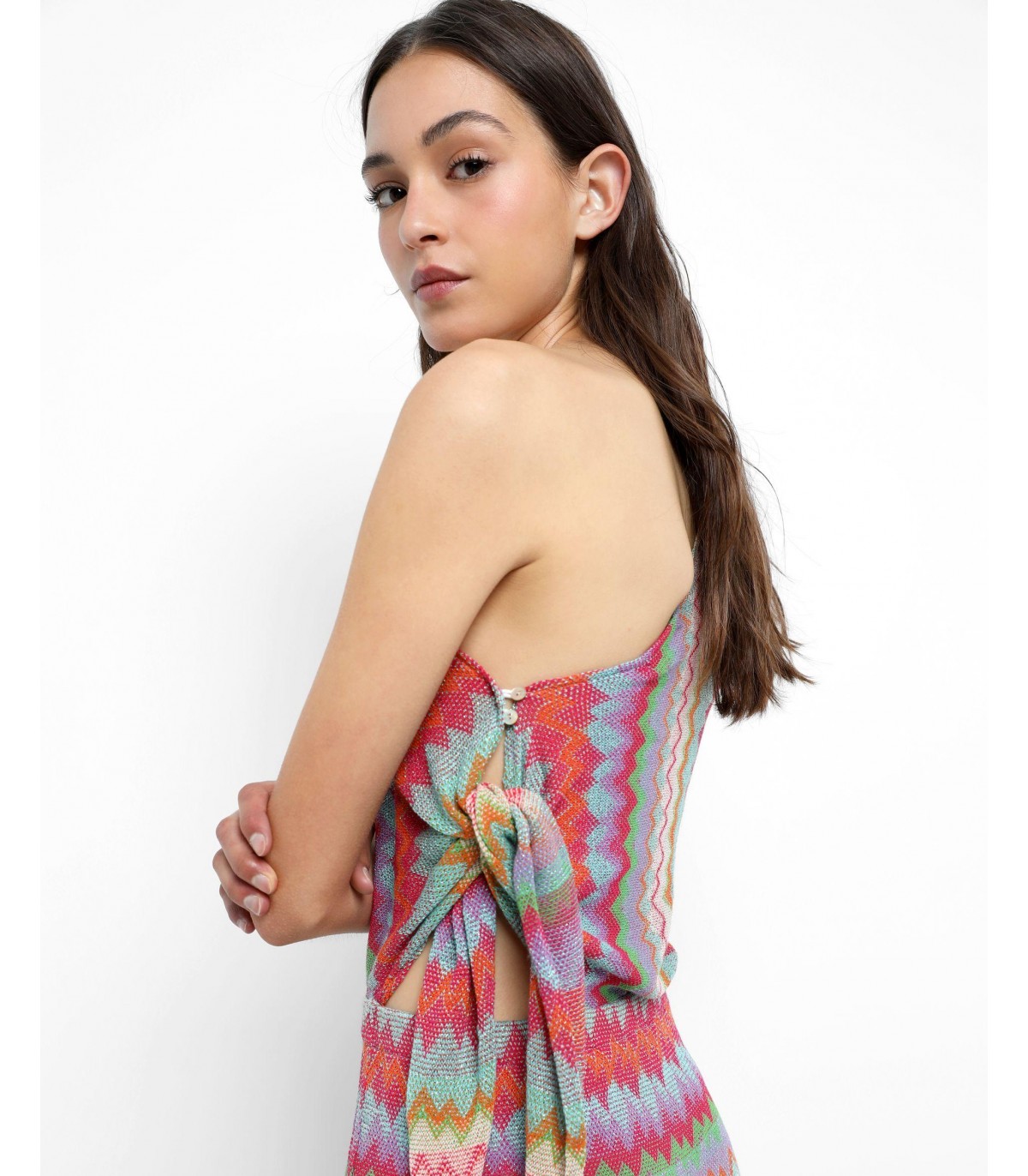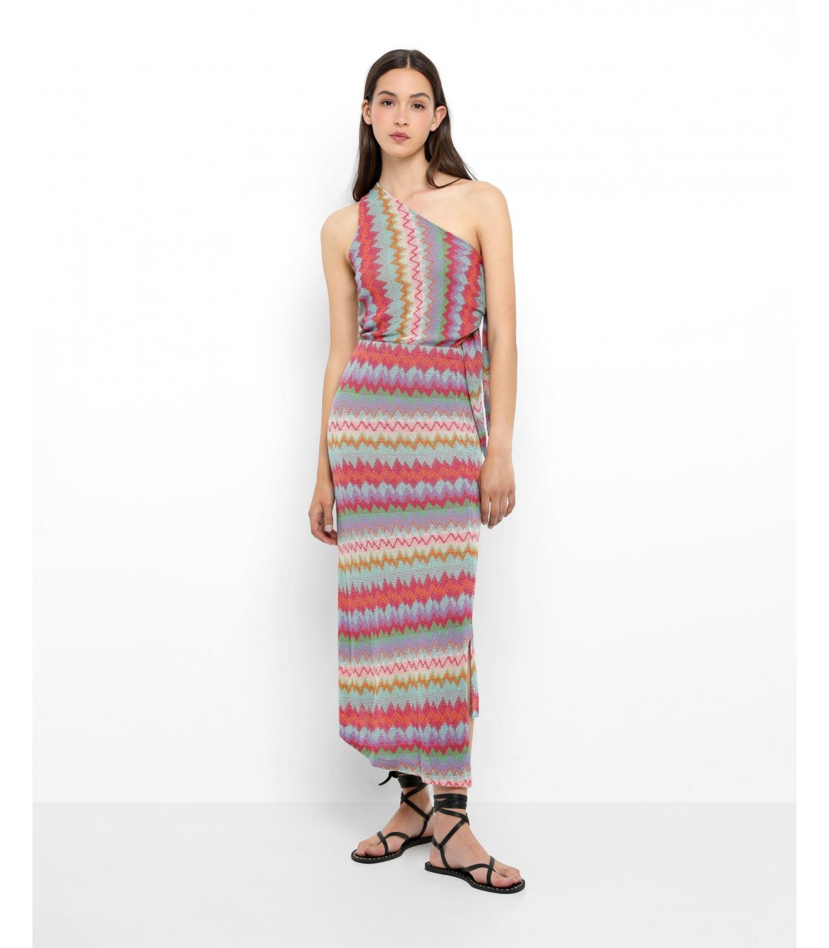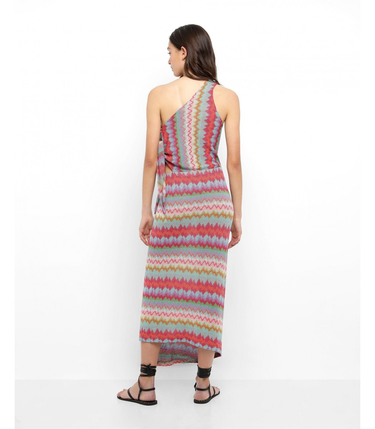 - Vestido midi de punto multicolor. Corte Slim Fit con escote asimétrico, cierre lateral con botones y nudo.