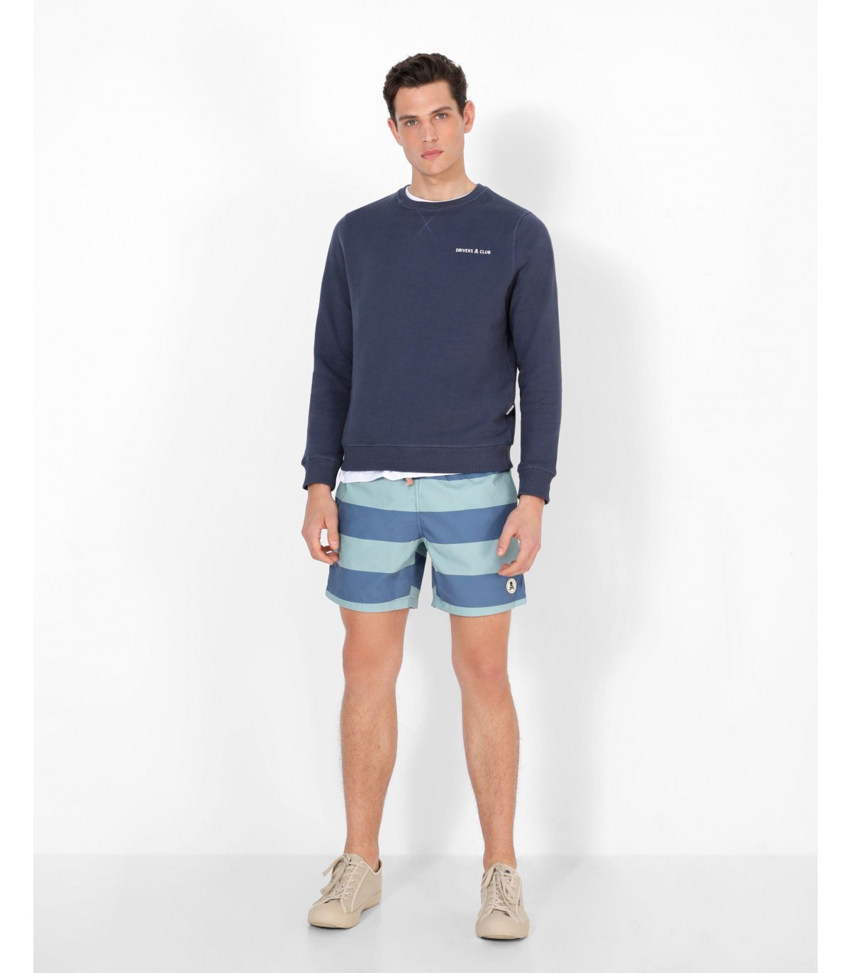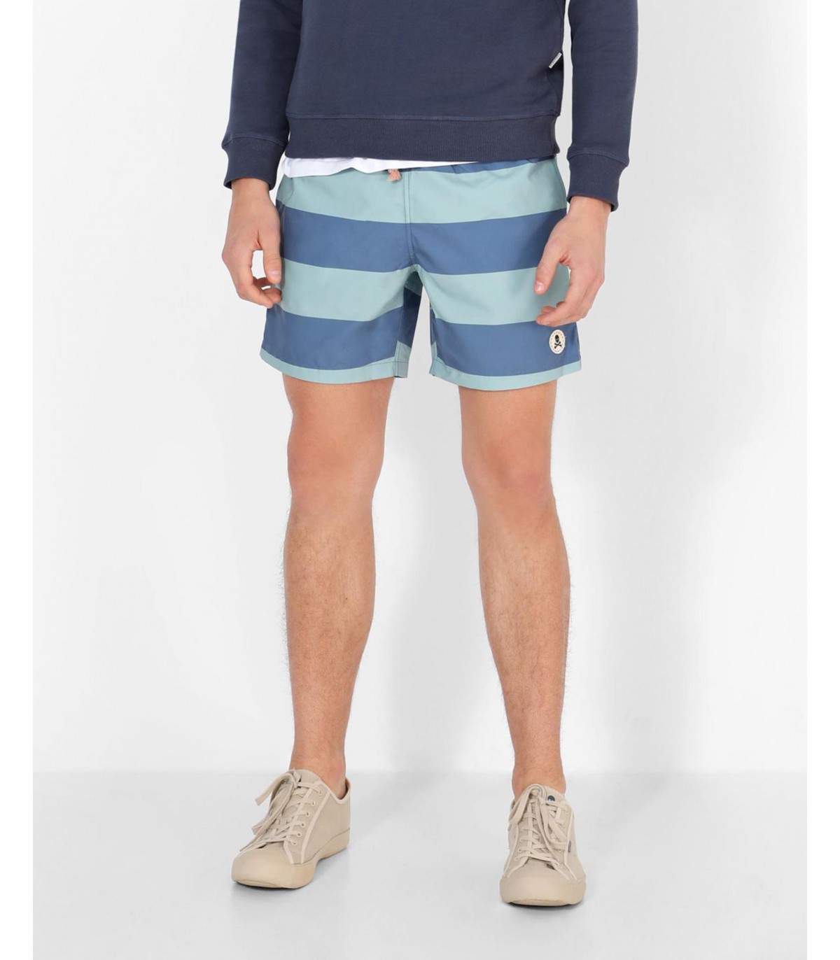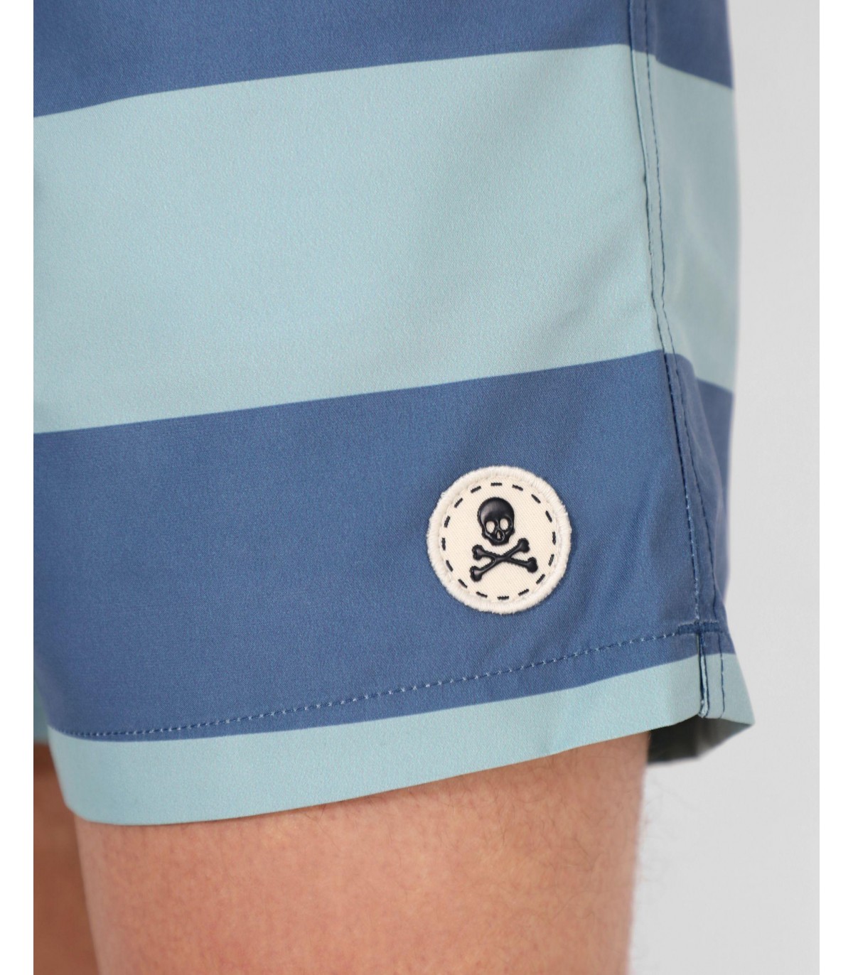 - Bañador con estampado de rayas. Corte Regular Fit, cierre con cordón y cintura elástica. Bolsillos laterales y trasero y detalle de parche de calavera.