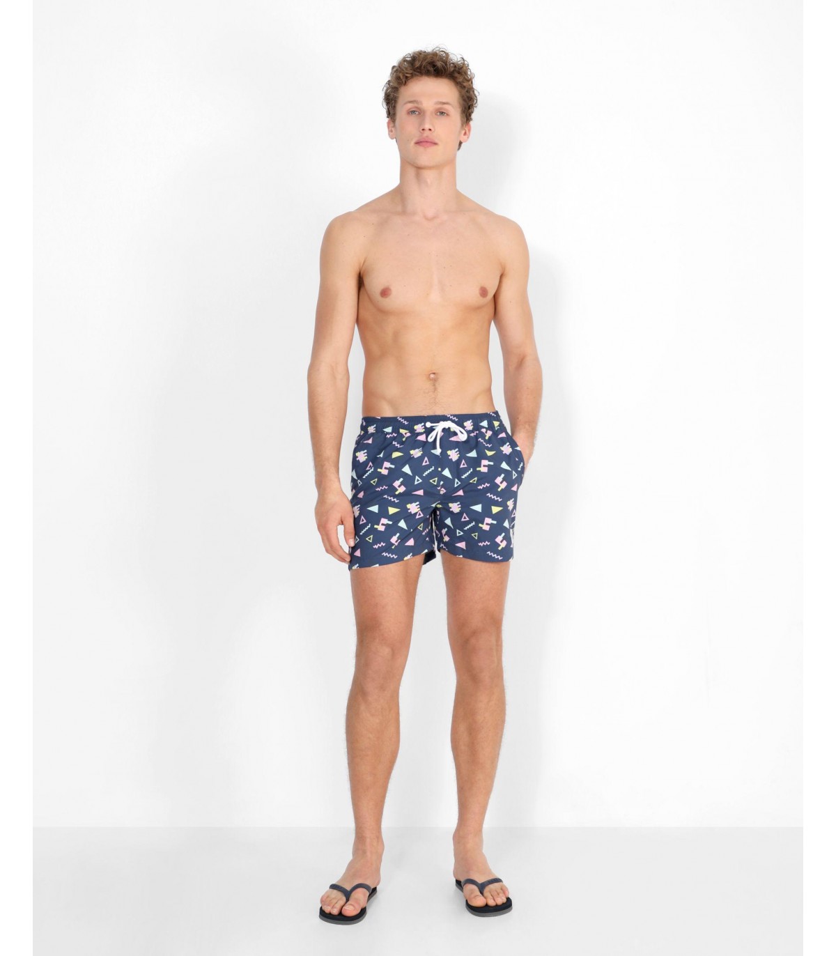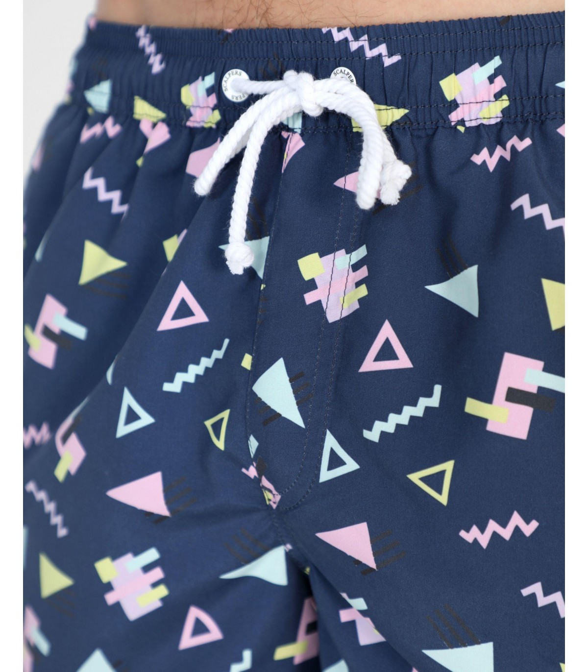 Bañador con prints geométricos confeccionado en tejido de poliéster. Corte Regular Fit, cierre con cordón y velcro y detalle de calavera engomada. Bolsillos laterales y traseros.
