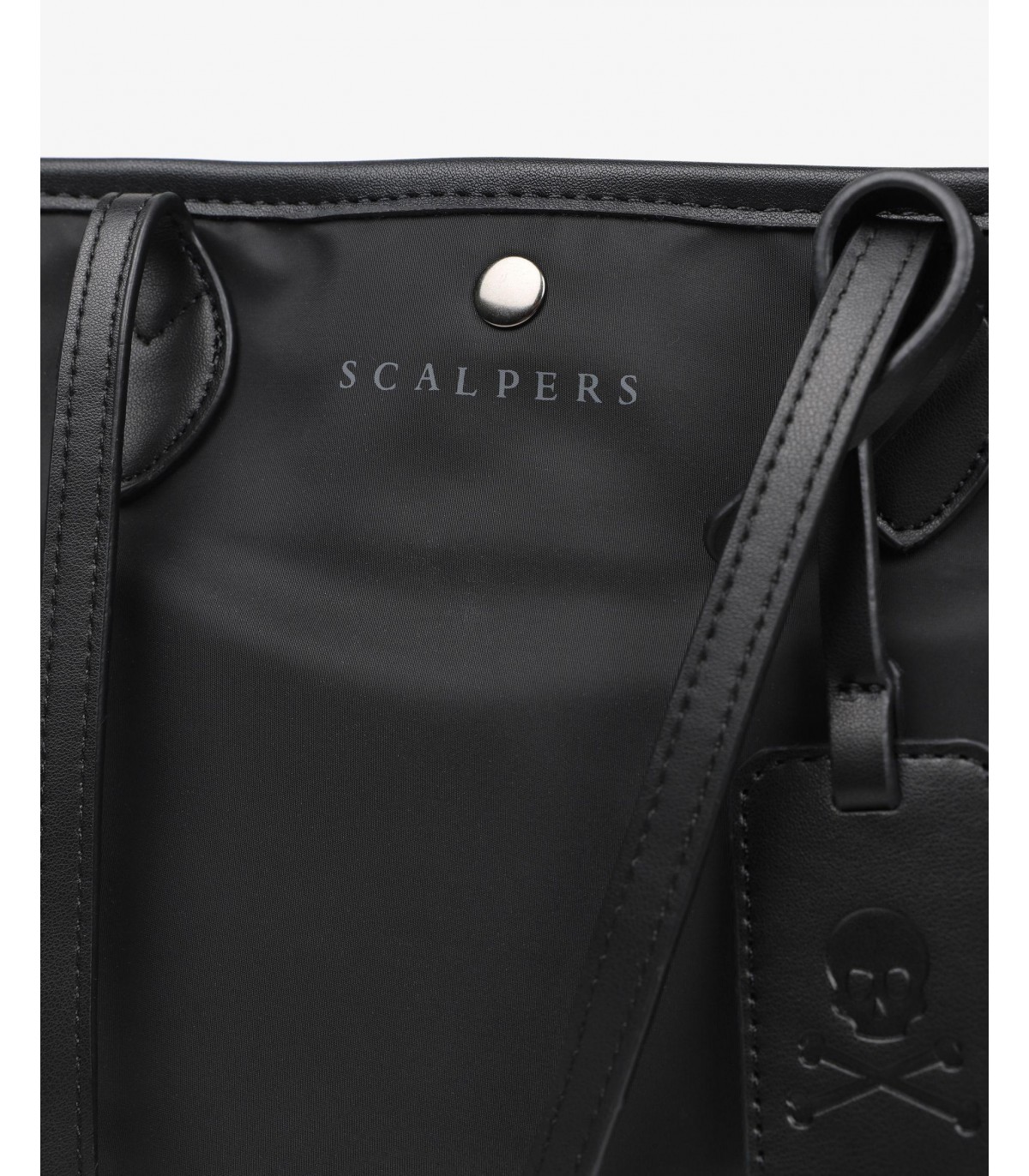 - Bolso shopper mini confeccionado en tejido técnico. Doble asa de piel, cierre con cremallera y bolsillos interiores. Detalle de calavera en piel.