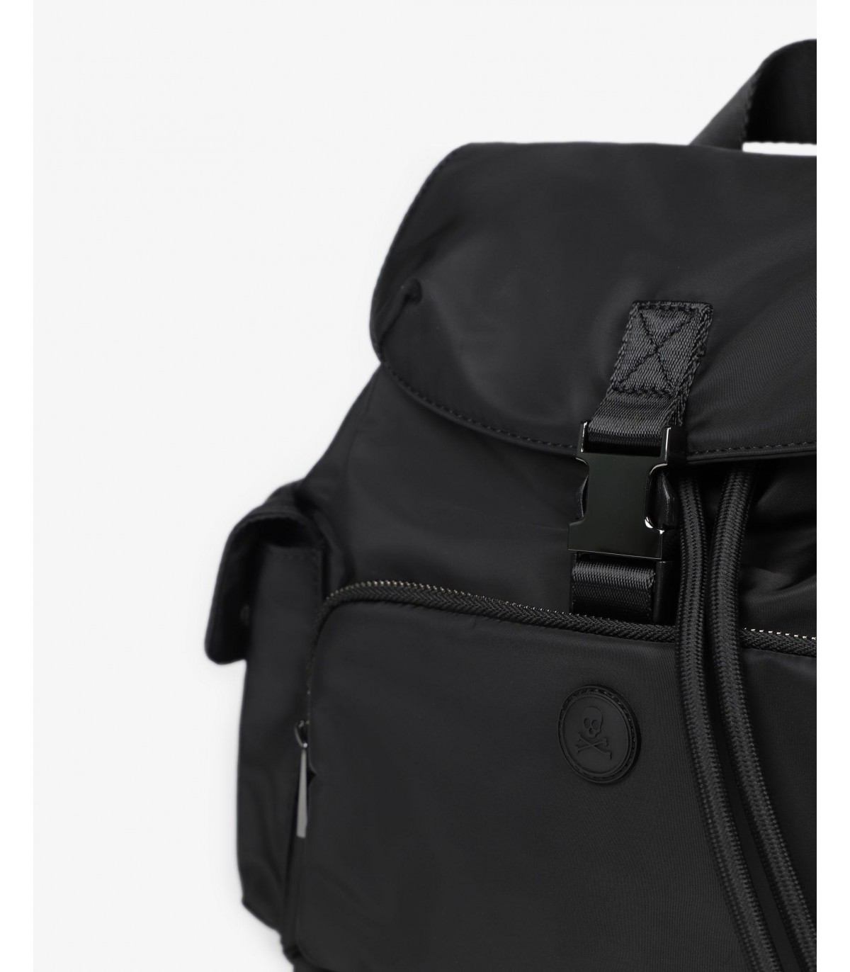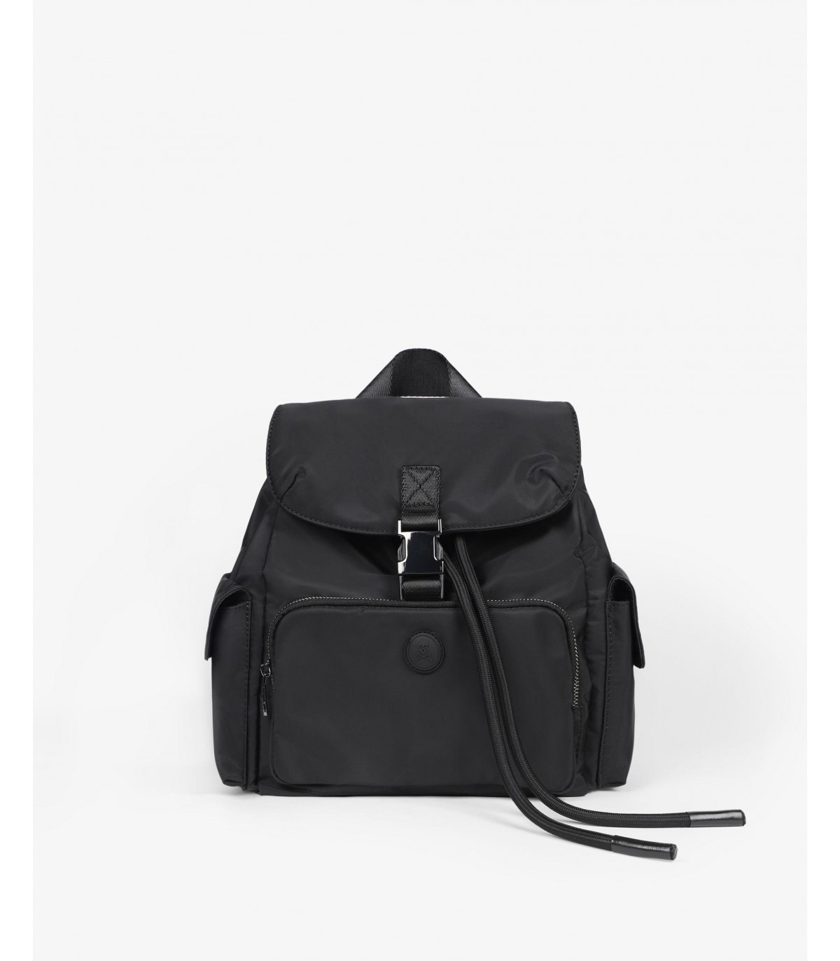 - Mochila confeccionada en tejido técnico. Cierre tipo mochila con cordón ajustable. Bolsillos laterales y frontal con cremallera. Detalle de calavera engomada.