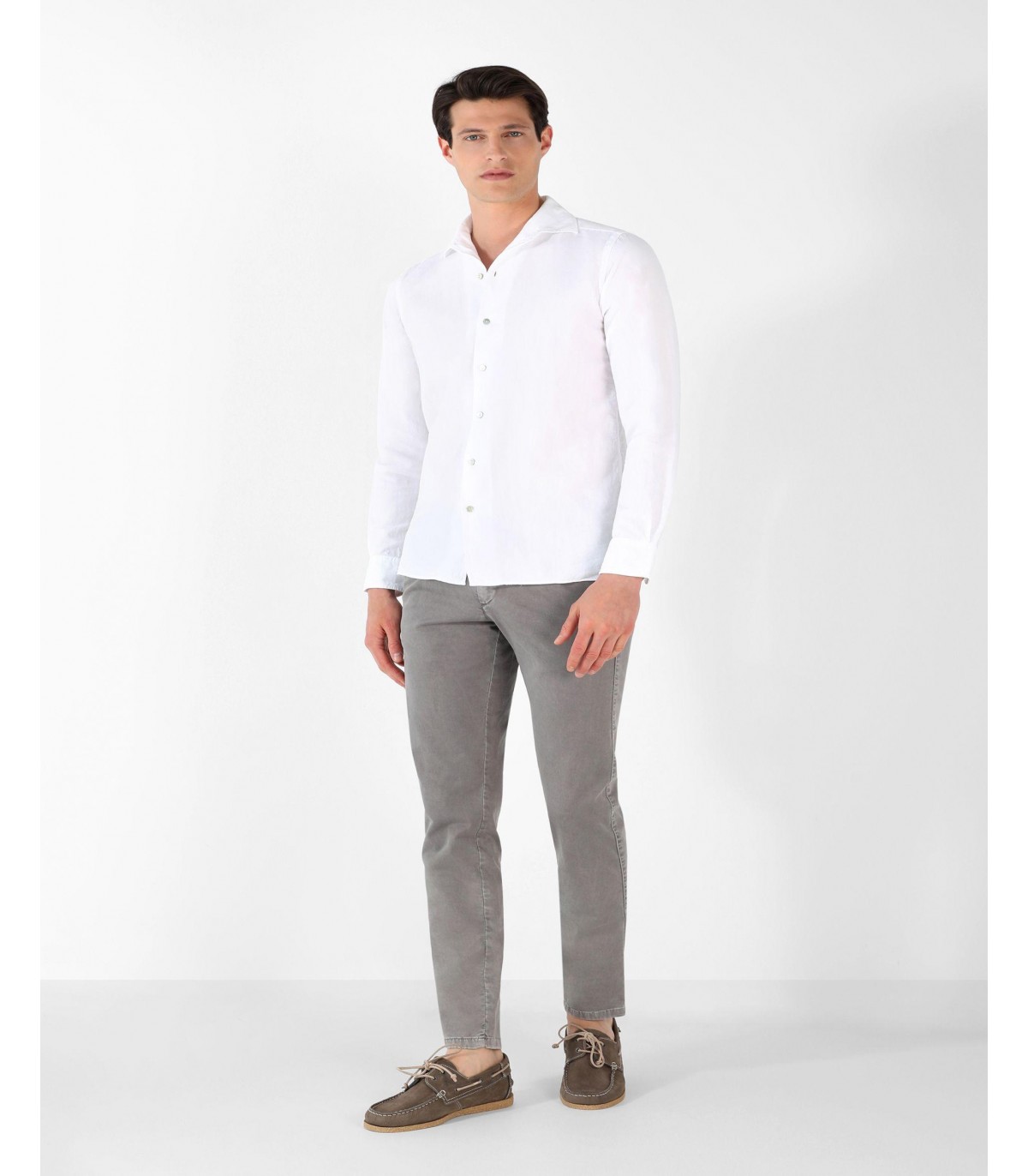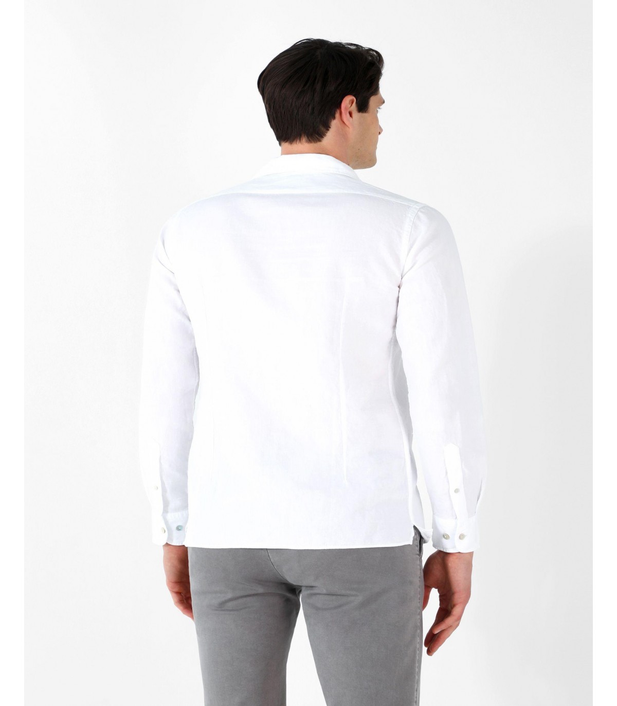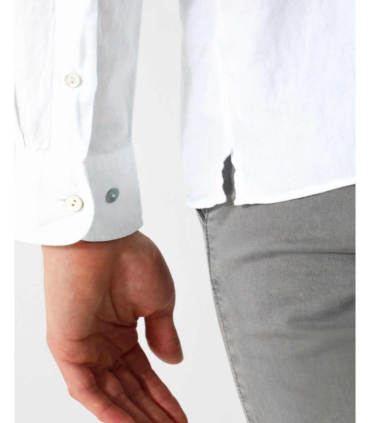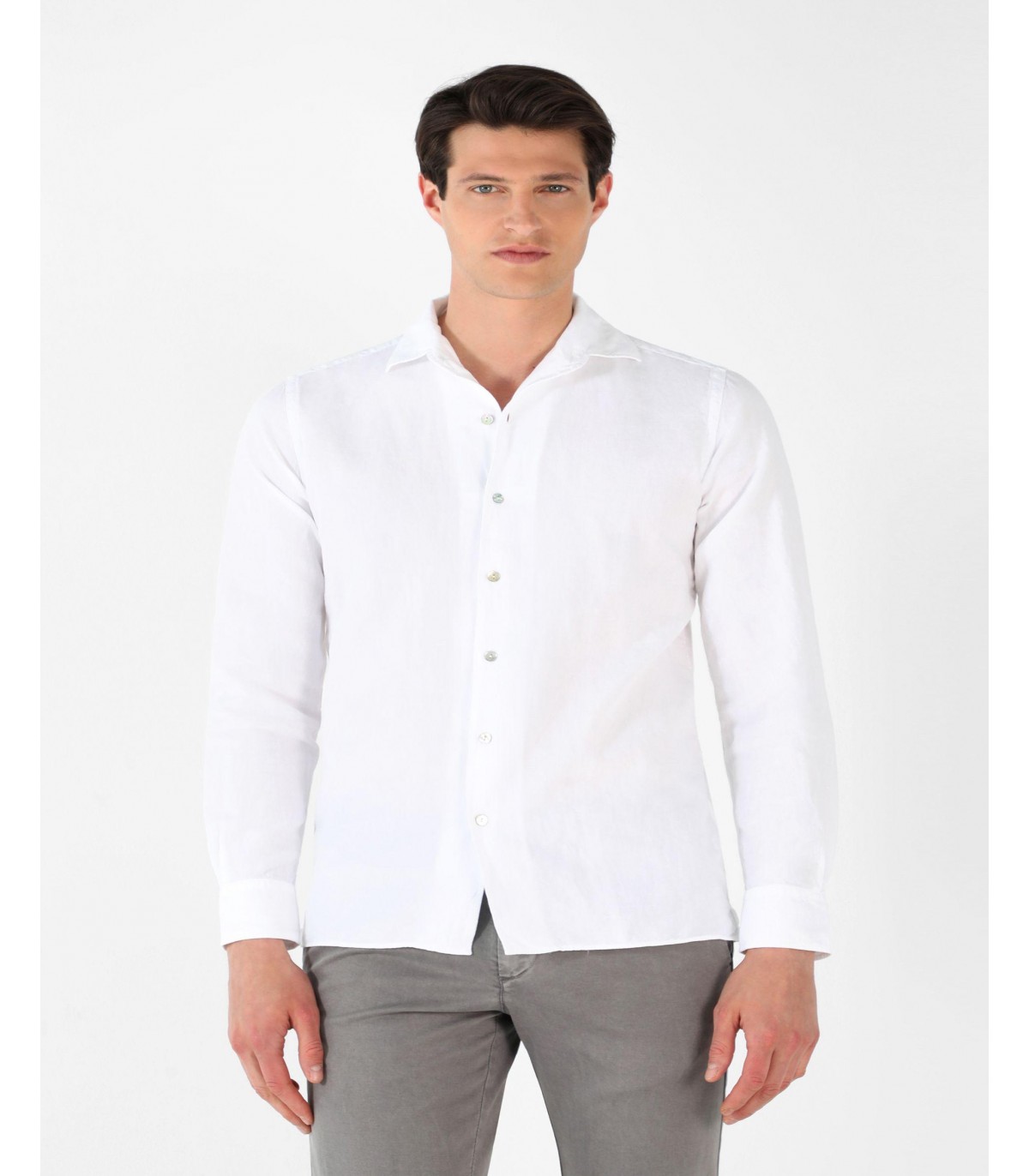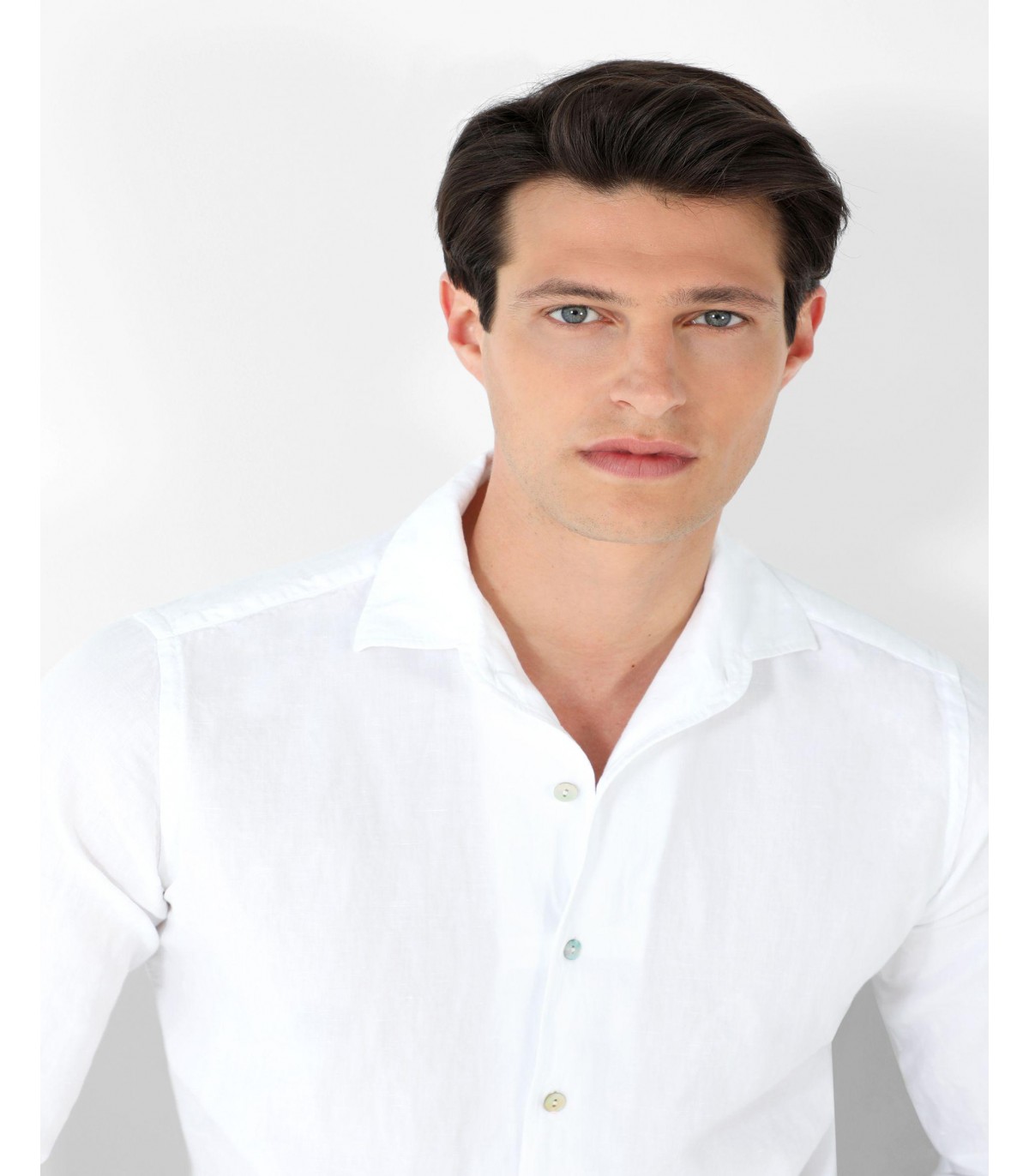 Camisa confeccionada en tejido 100% lino. Corte Regular Fit, cuello pijamero y cierre con botones. Manga larga terminada en puño con botones.
