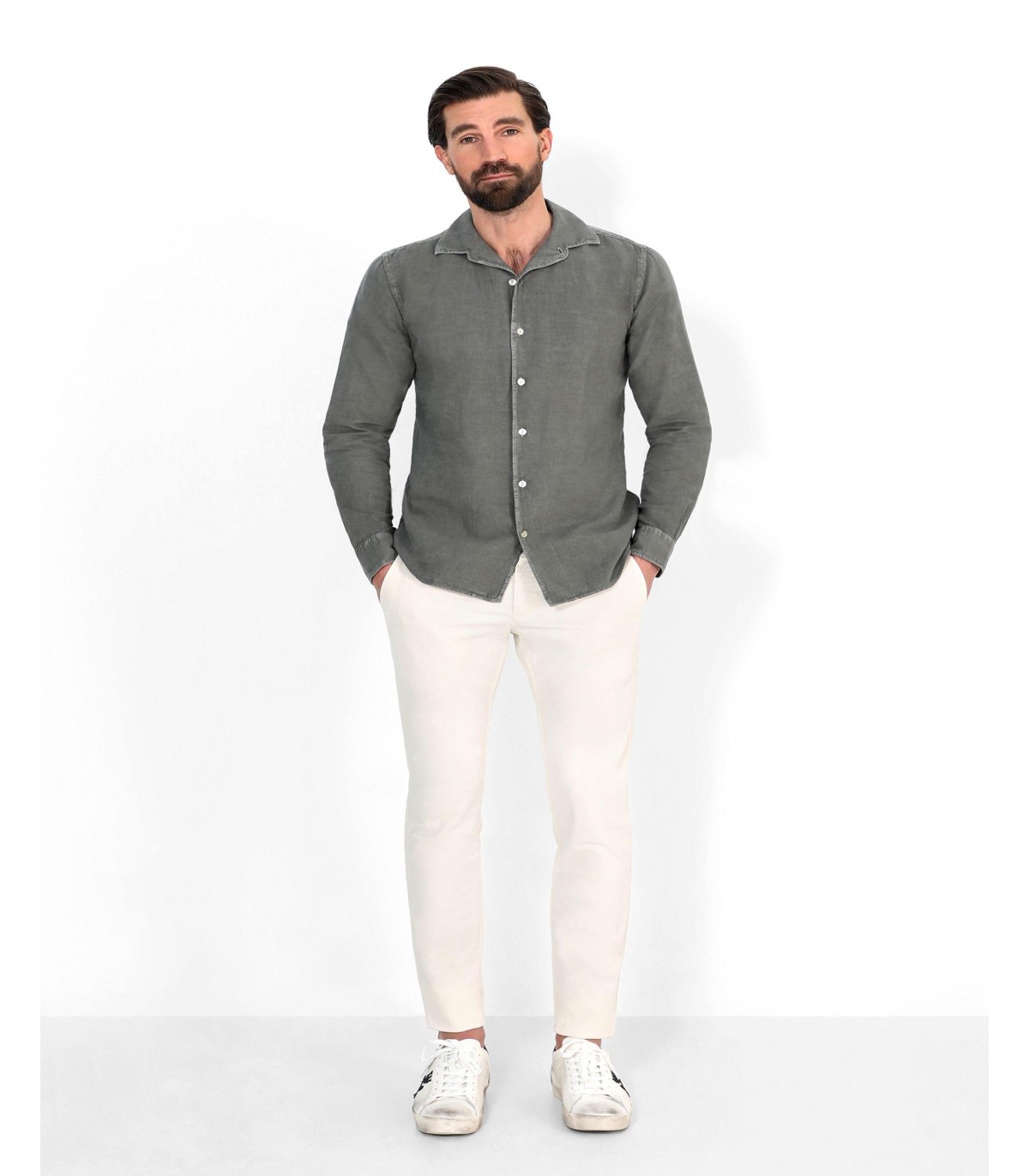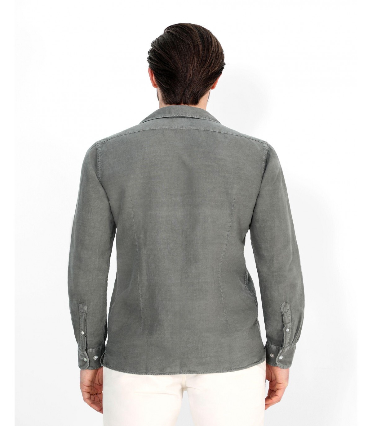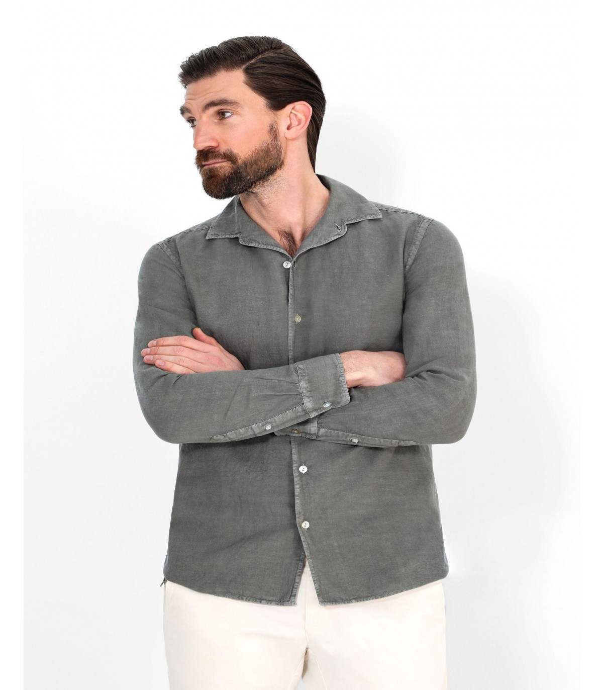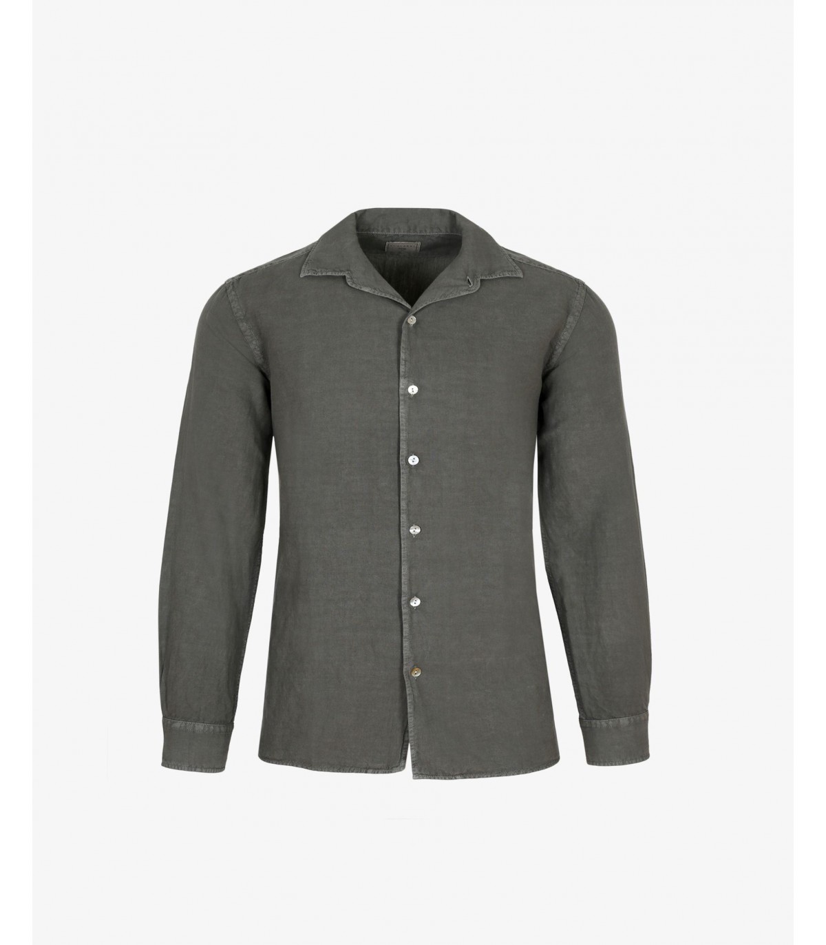 Camisa confeccionada en tejido 100% lino. Corte Regular Fit, cuello pijamero y cierre con botones. Manga larga terminada en puño con botones.