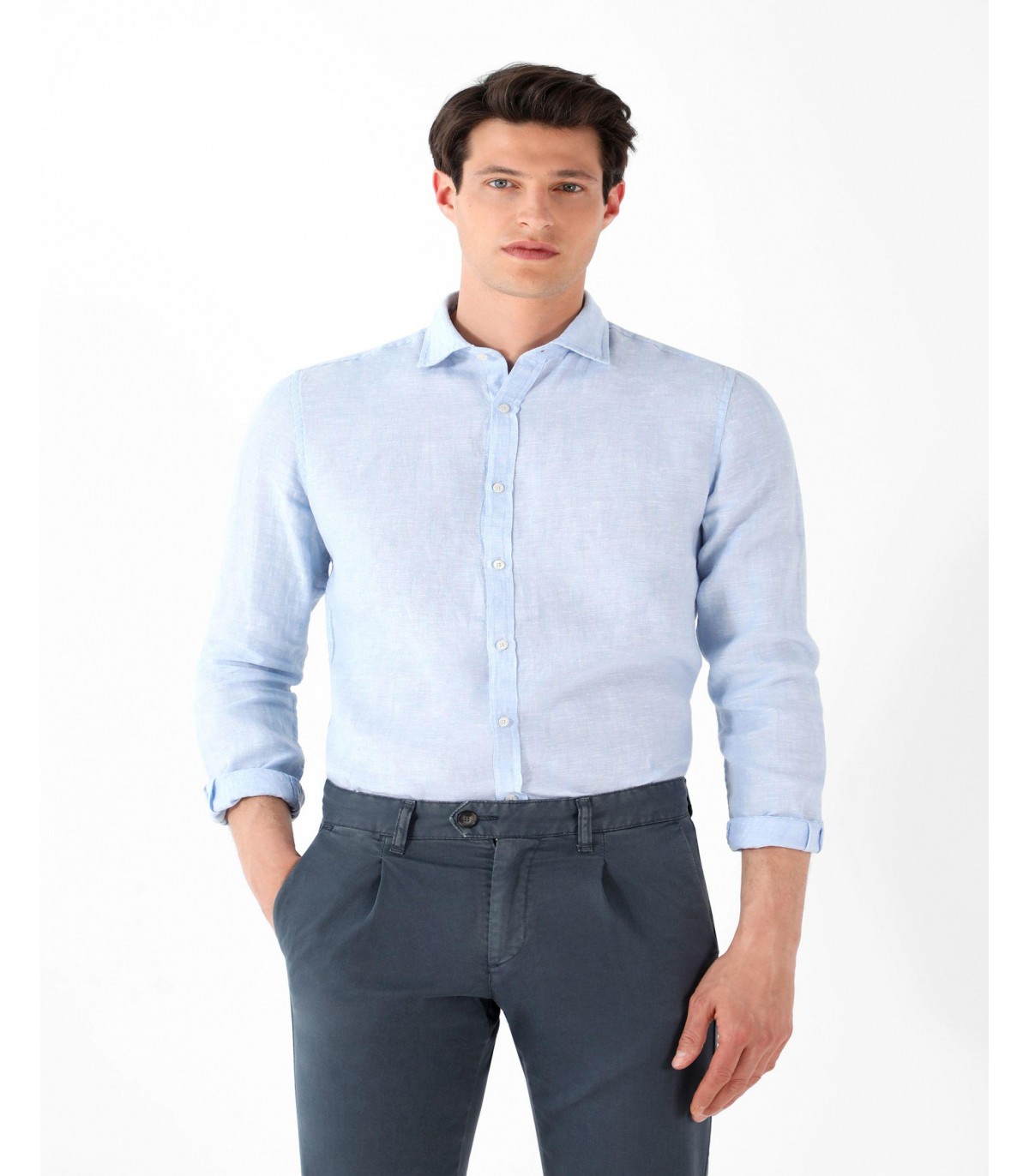 Camisa confeccionada en tejido 100% lino. Corte Slim Fit, cuello italiano y cierre con botones. Manga larga terminada en puño con botones.