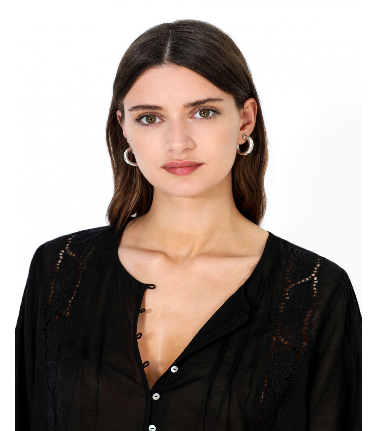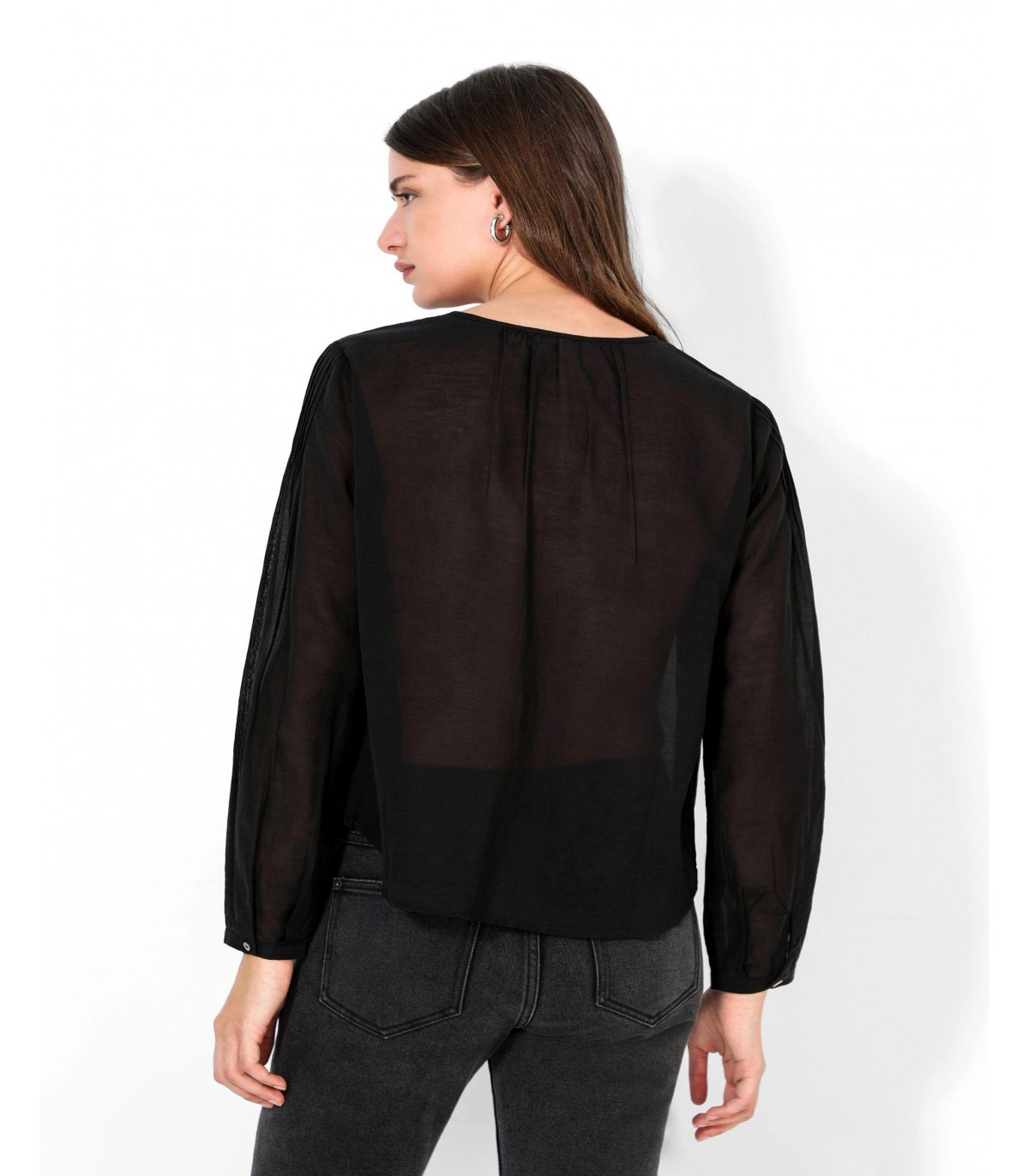 - Camisa confeccionada en tejido mezcla de algodón. Corte Regular Fit, cuello redondo y cierre con botones. Manga larga terminada en puño y detalles perforados y plisados.
