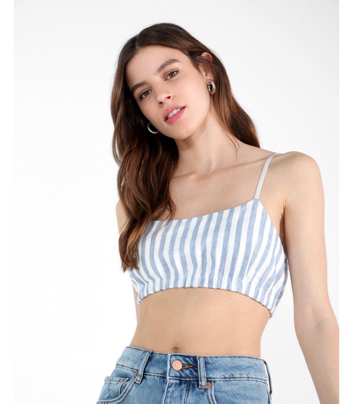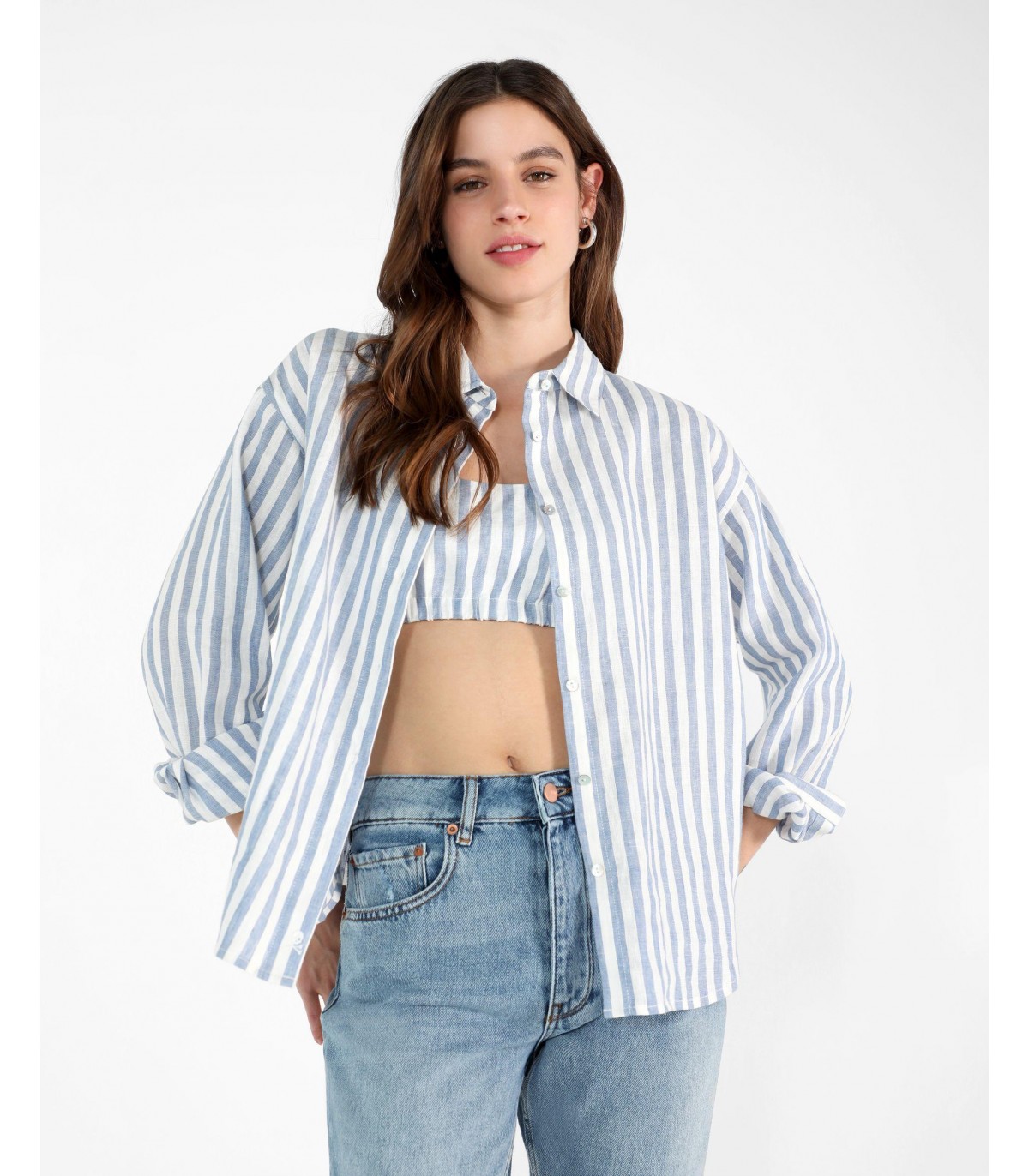 - Camisa con estampado de rayas. Corte Regular Fit, cuello clásico y cierre con botones. Manga larga terminada en puño con botones. Incluye crop top de rayas.