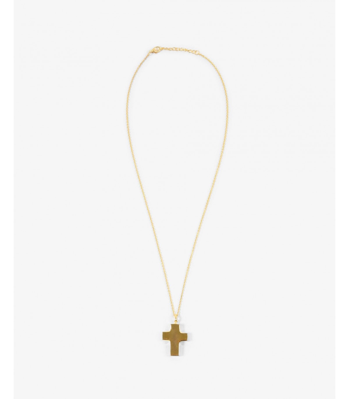 Collar con cruz grande de bronce bañado en oro de 18k. Cadena y colgante y cierre con mosquetón.