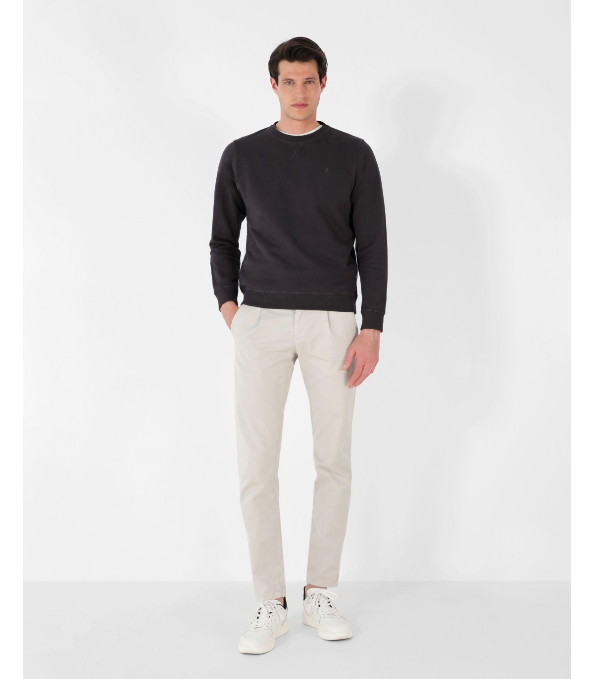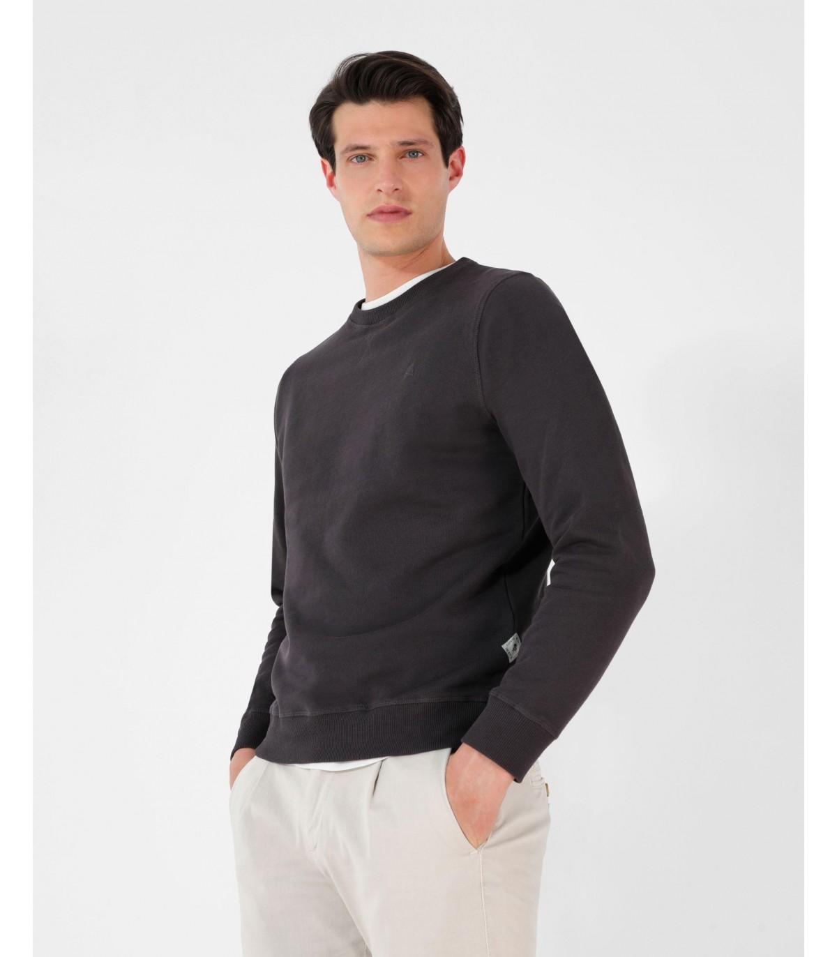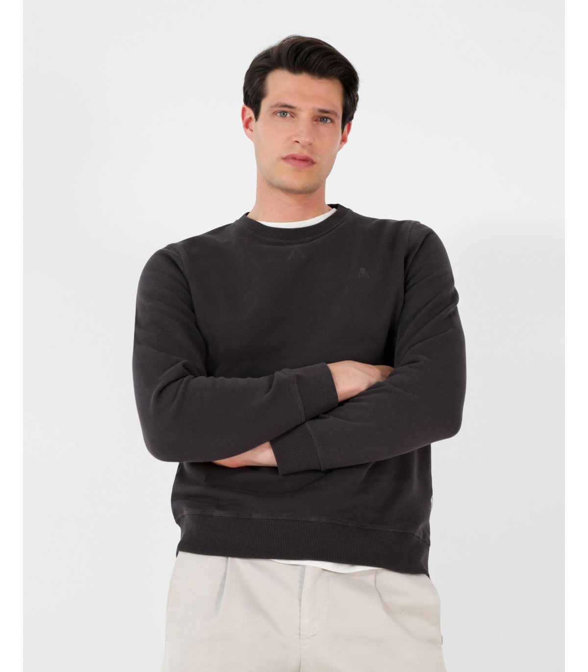 Sudadera confeccionada en tejido 100% algodón orgánico con lavado stone wash. Corte Regular Fit, cuello redondo y manga larga terminada en rib. Detalle de cosido en cruz en el cuello, etiqueta decorativa en puño y calavera bordada a tono en el pecho.