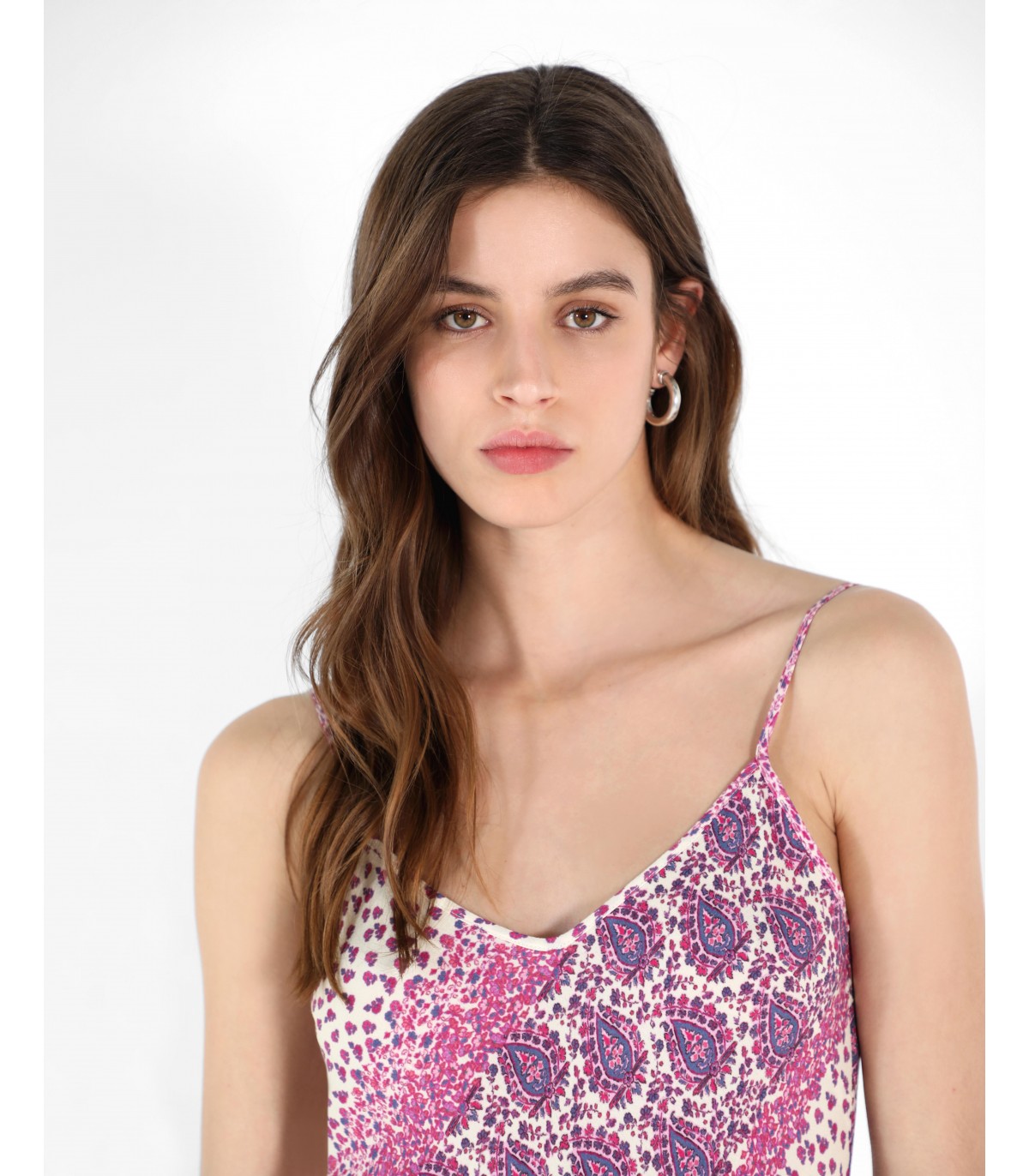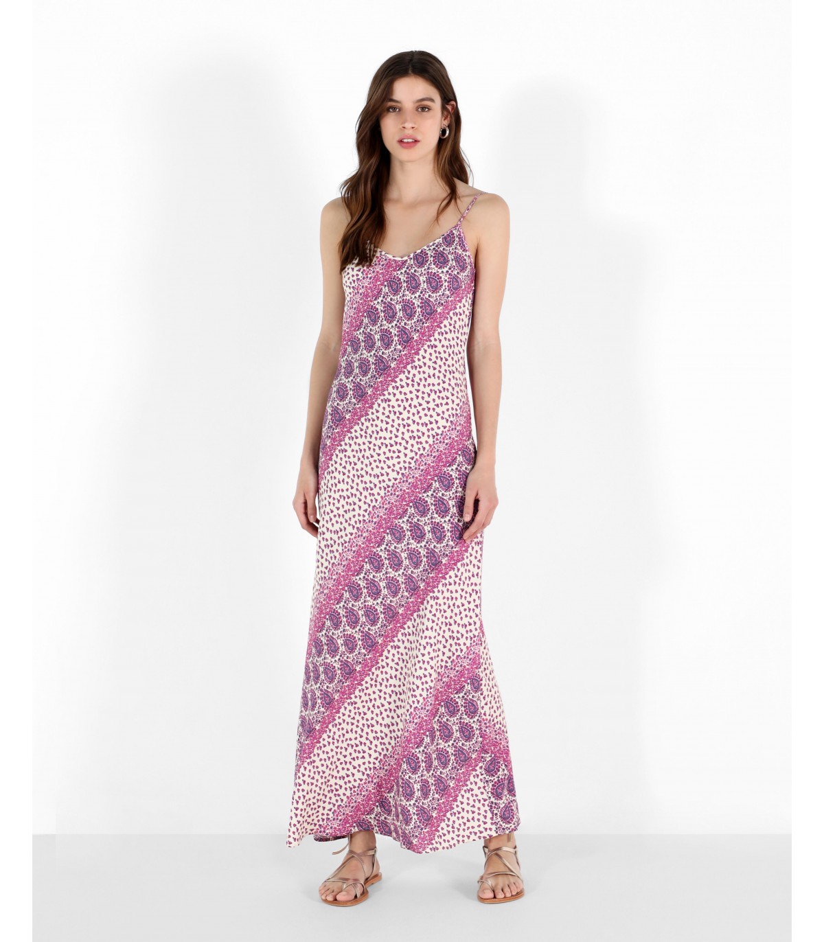 Vestido largo con estampado. Corte Regular Fit, escote de pico y tirantes.
