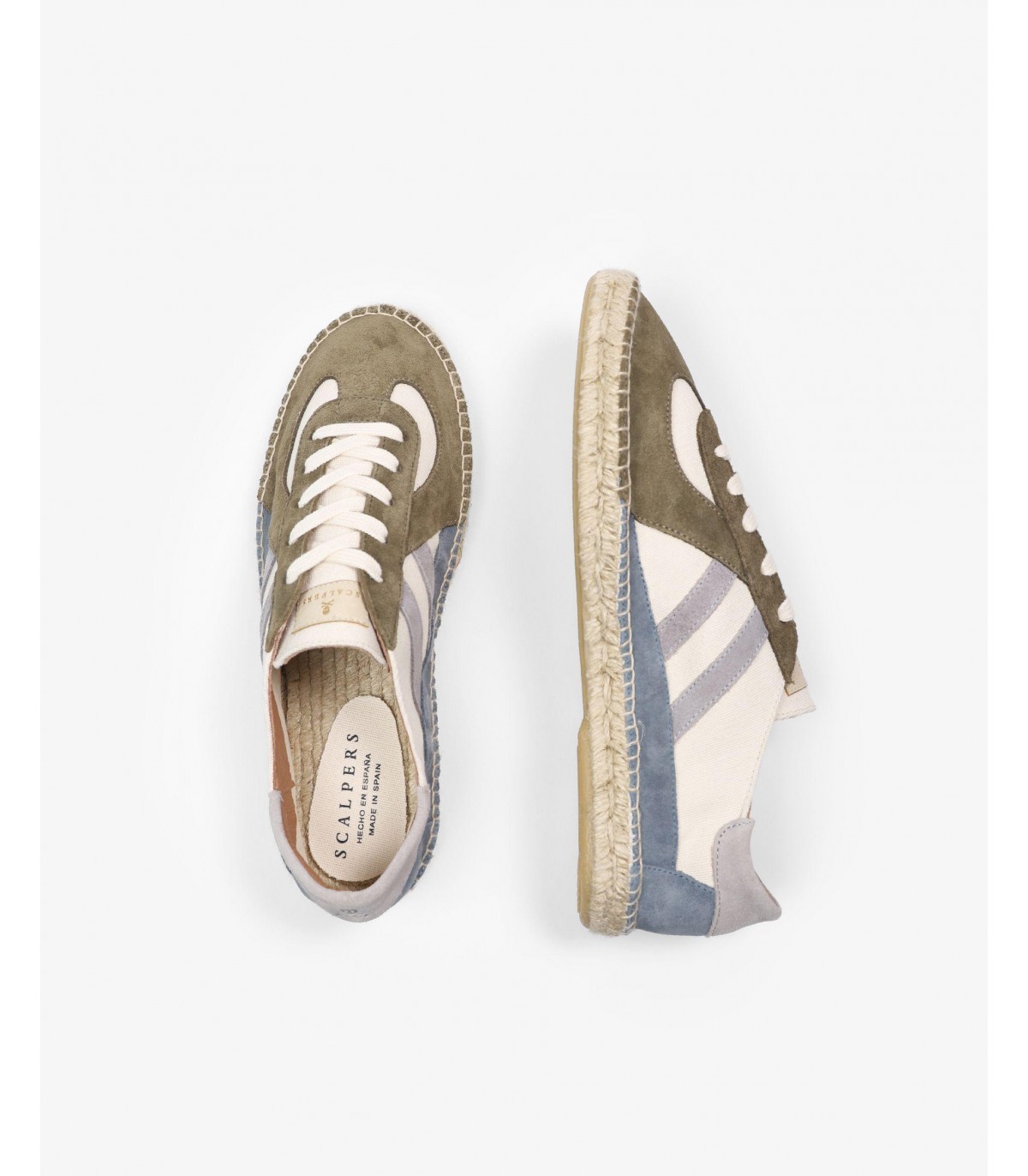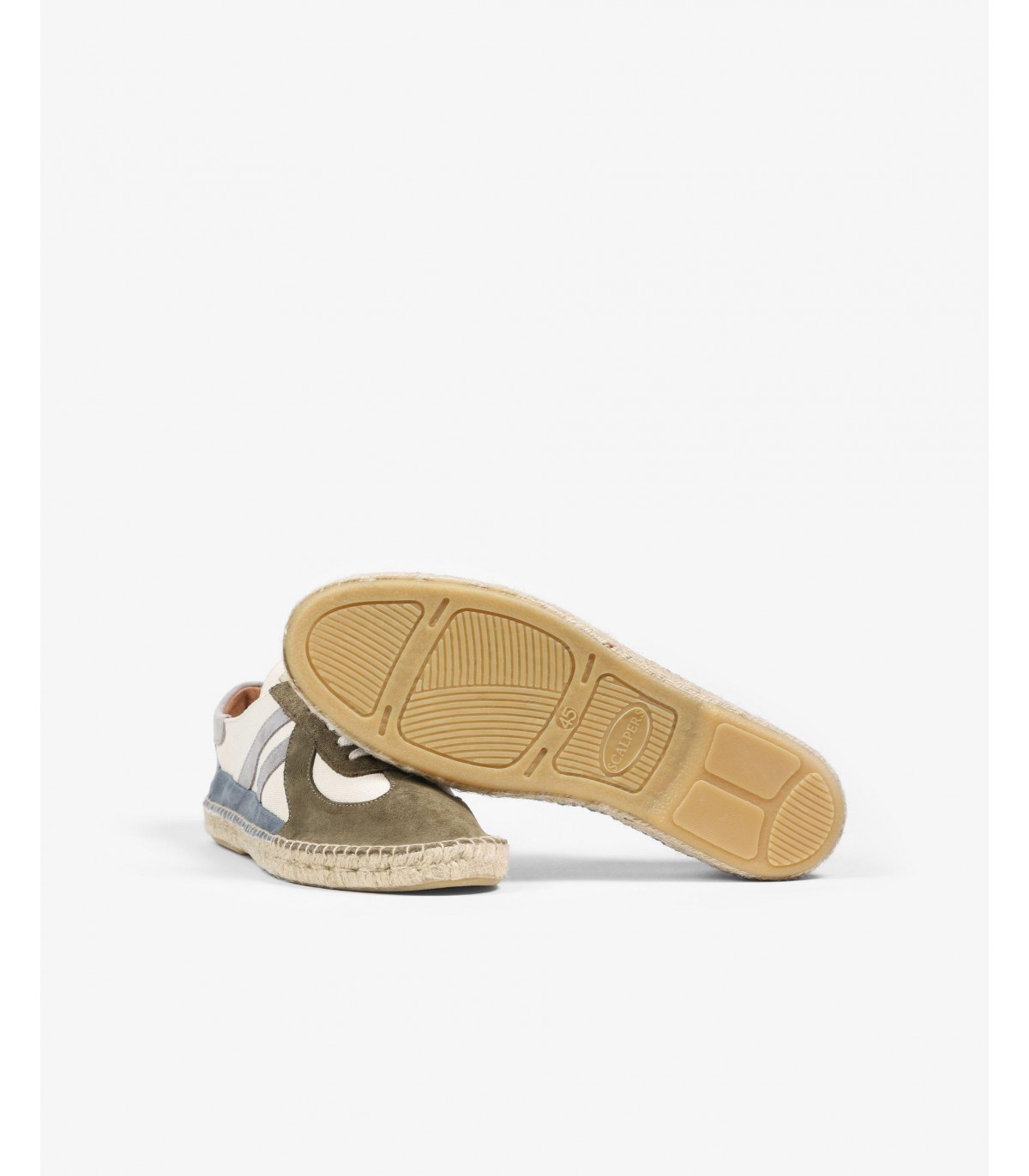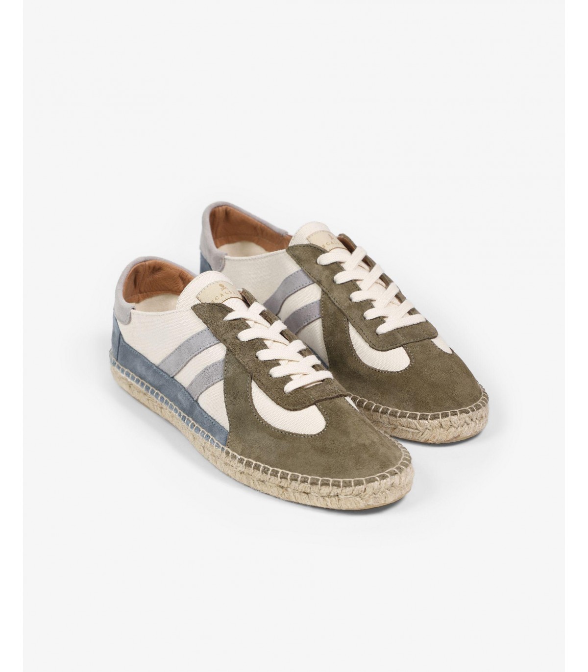 Alpargatas confeccionadas en tejido de canvas y piel. Cierre con cordones, suela de goma y yute y detalle de rayas laterales.