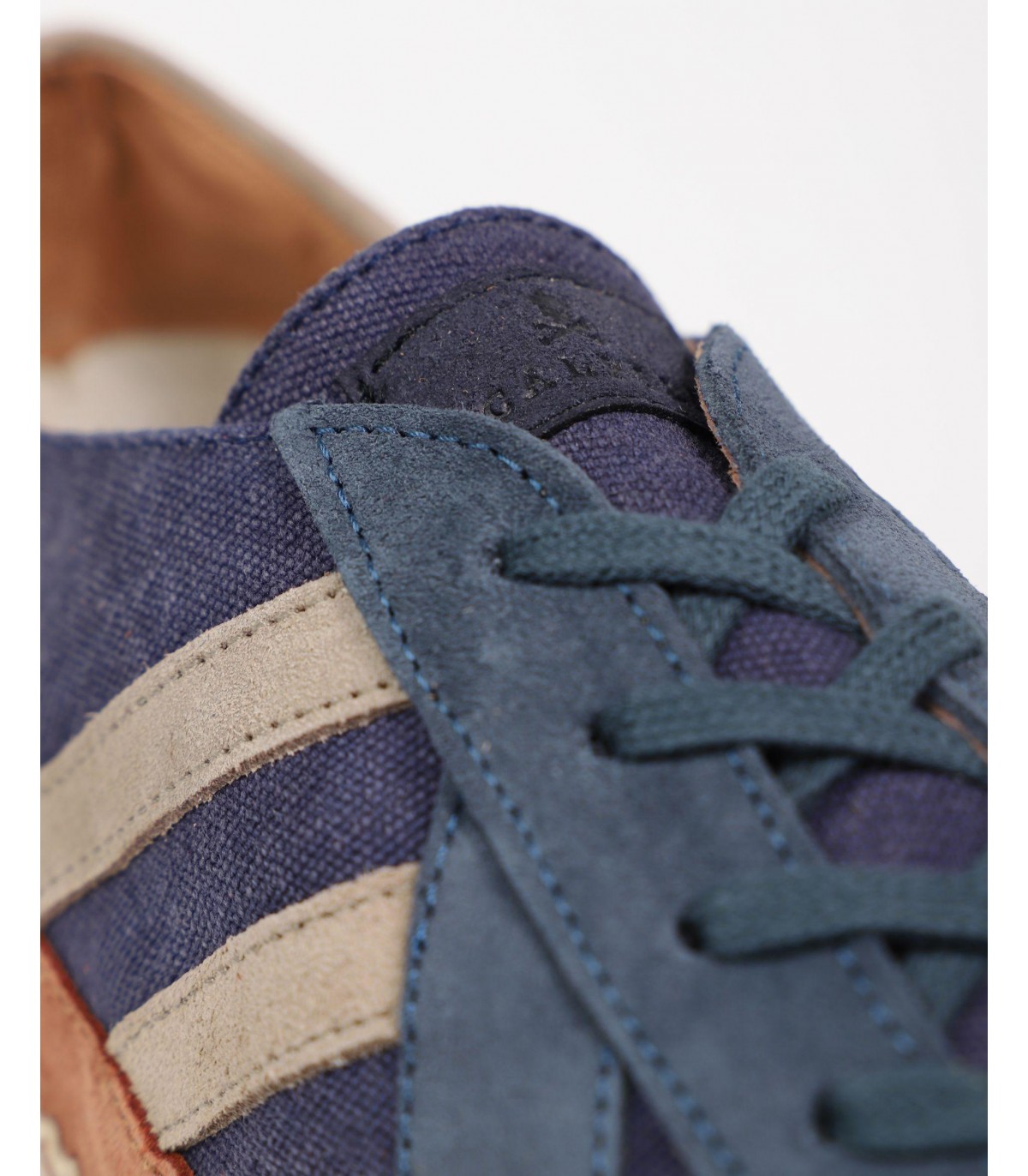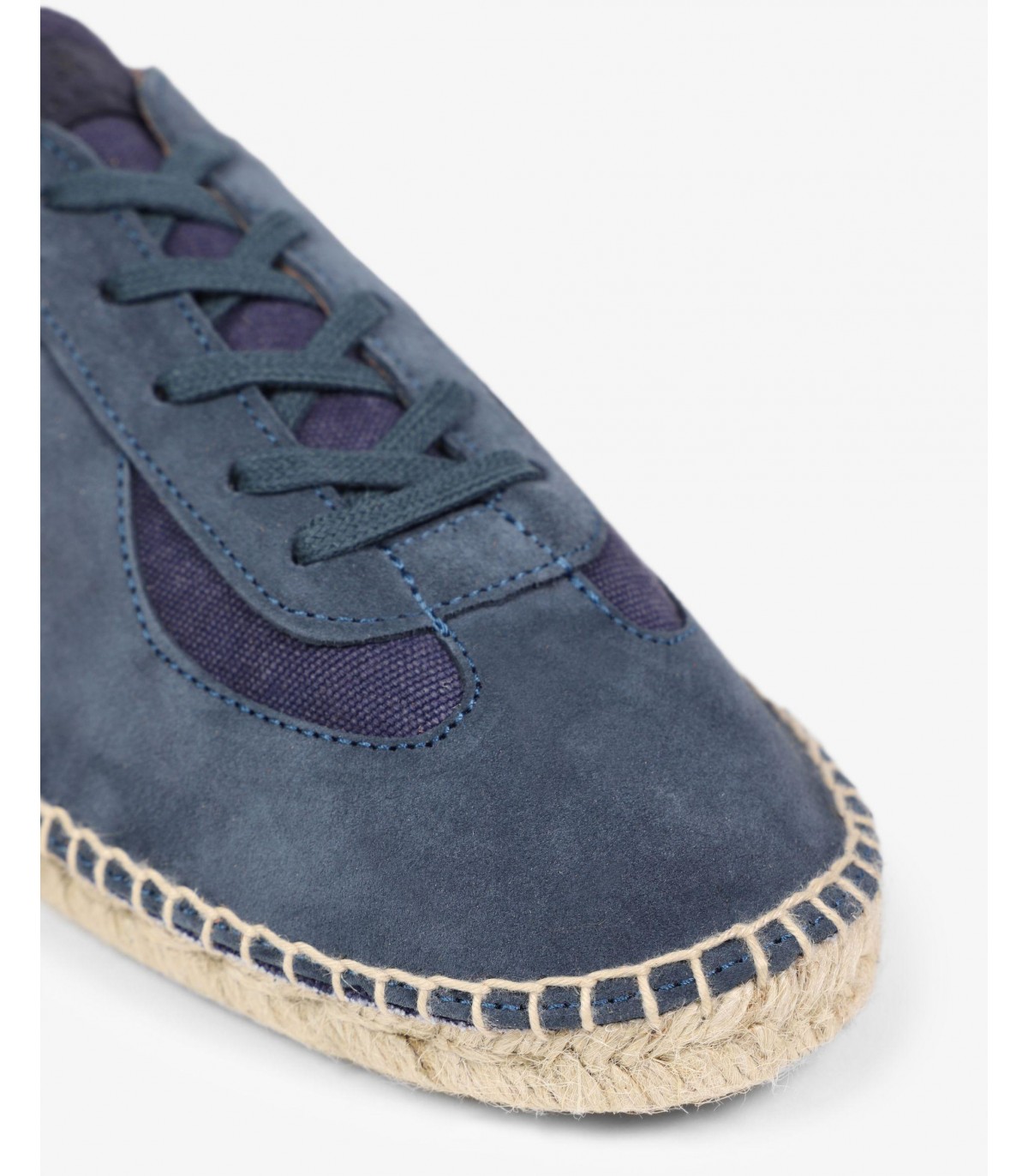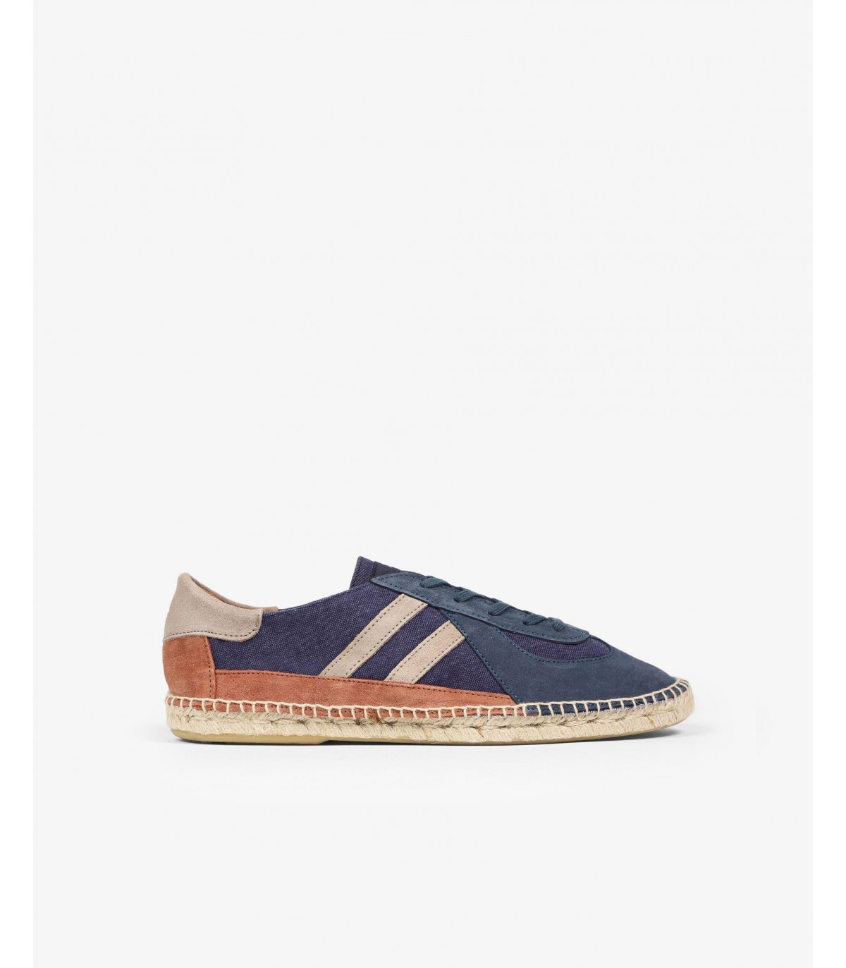 Alpargatas confeccionadas en tejido de canvas y piel. Cierre con cordones, suela de goma y yute y detalle de rayas laterales.