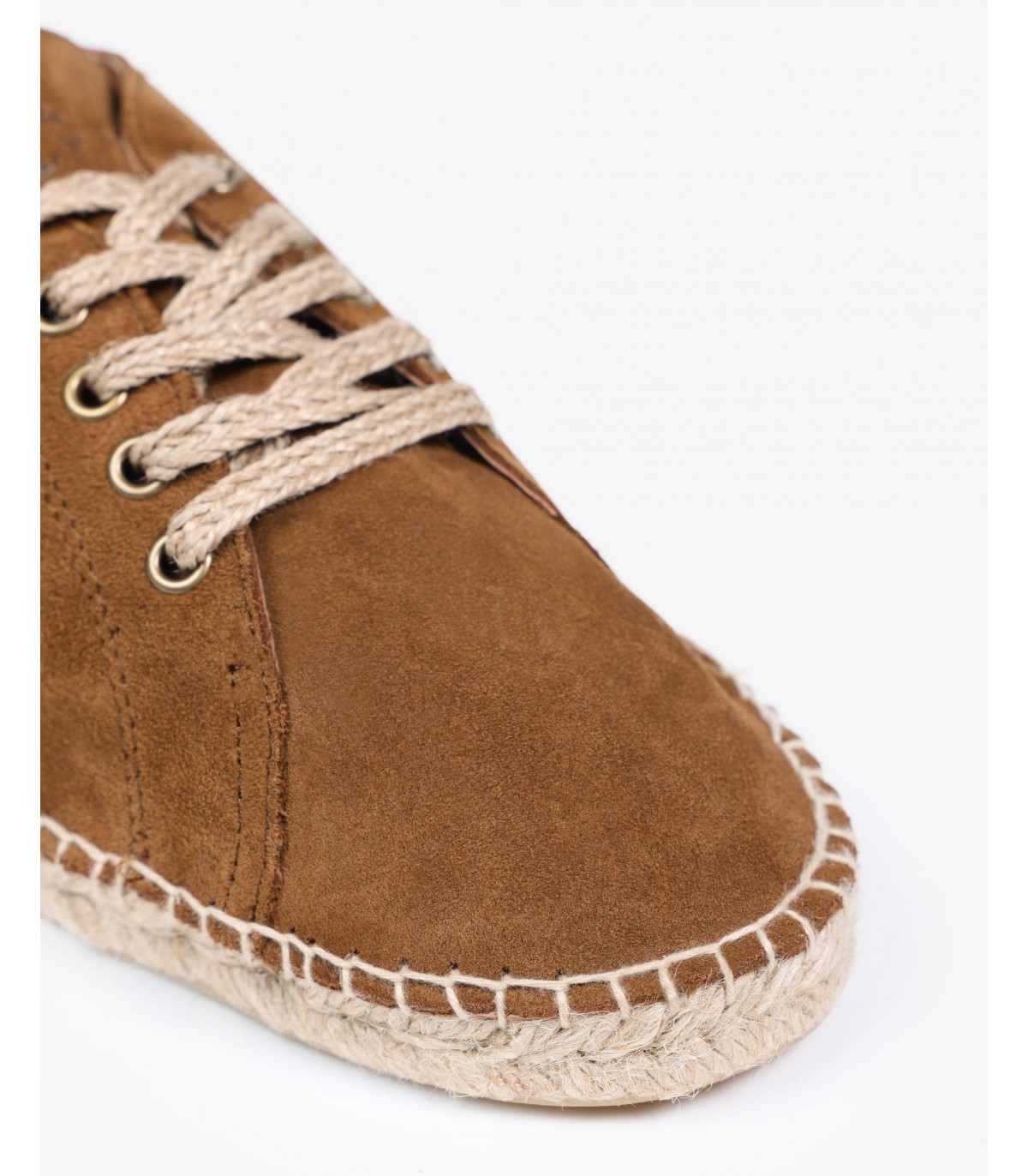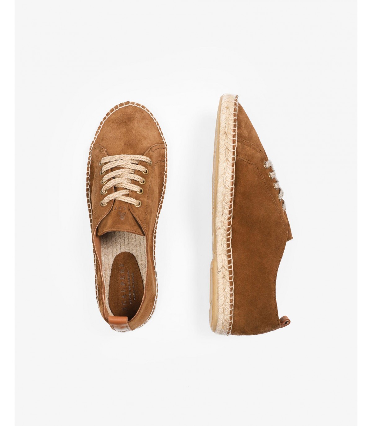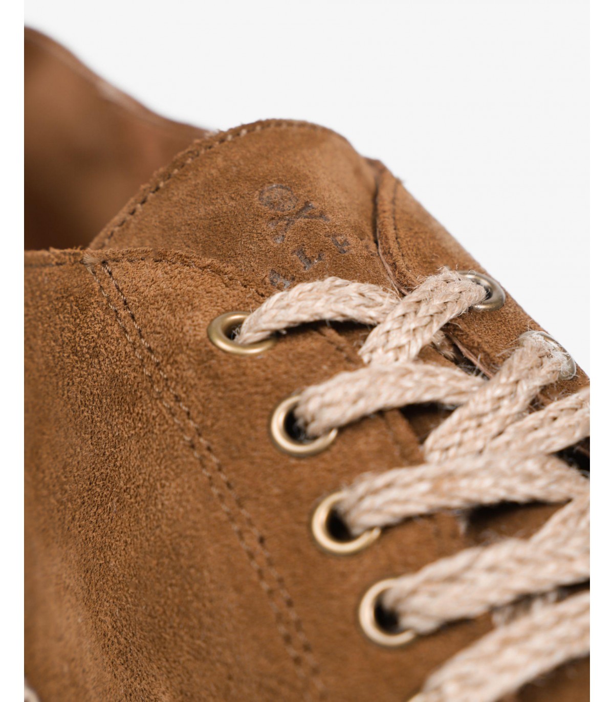 - Alpargatas confeccionadas en tejido de piel terminada en ante. Cierre con cordones, suela de yute y goma y detalle de piel en la parte trasera con calavera grabada.